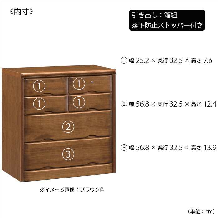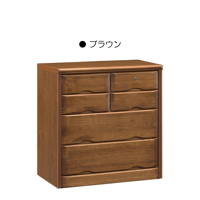 特  徴パイン材を表面材に採用したチェストです。最上部引き出しには防犯上安心な鍵付き。引き出しは落下防止ストッパー付き。ナチュラル・ブラウンの2色から選べます。