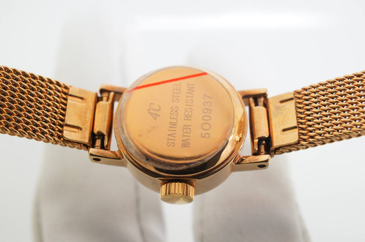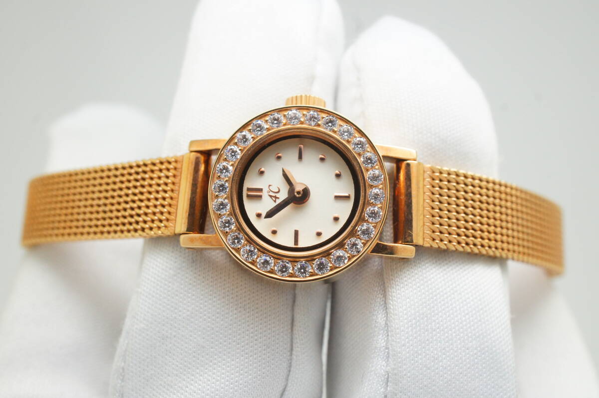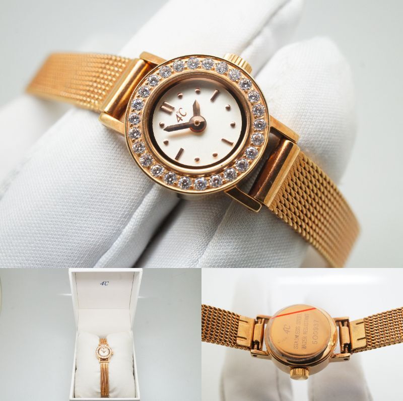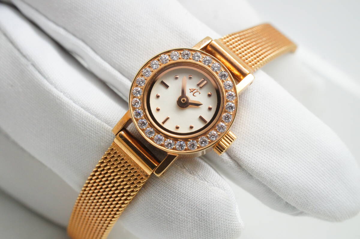E129●作動良好 箱付 未使用デッドストック 4℃ ヨンドシー ラインストーン レディース腕時計 ゴールド金 お洒落 クォーツ