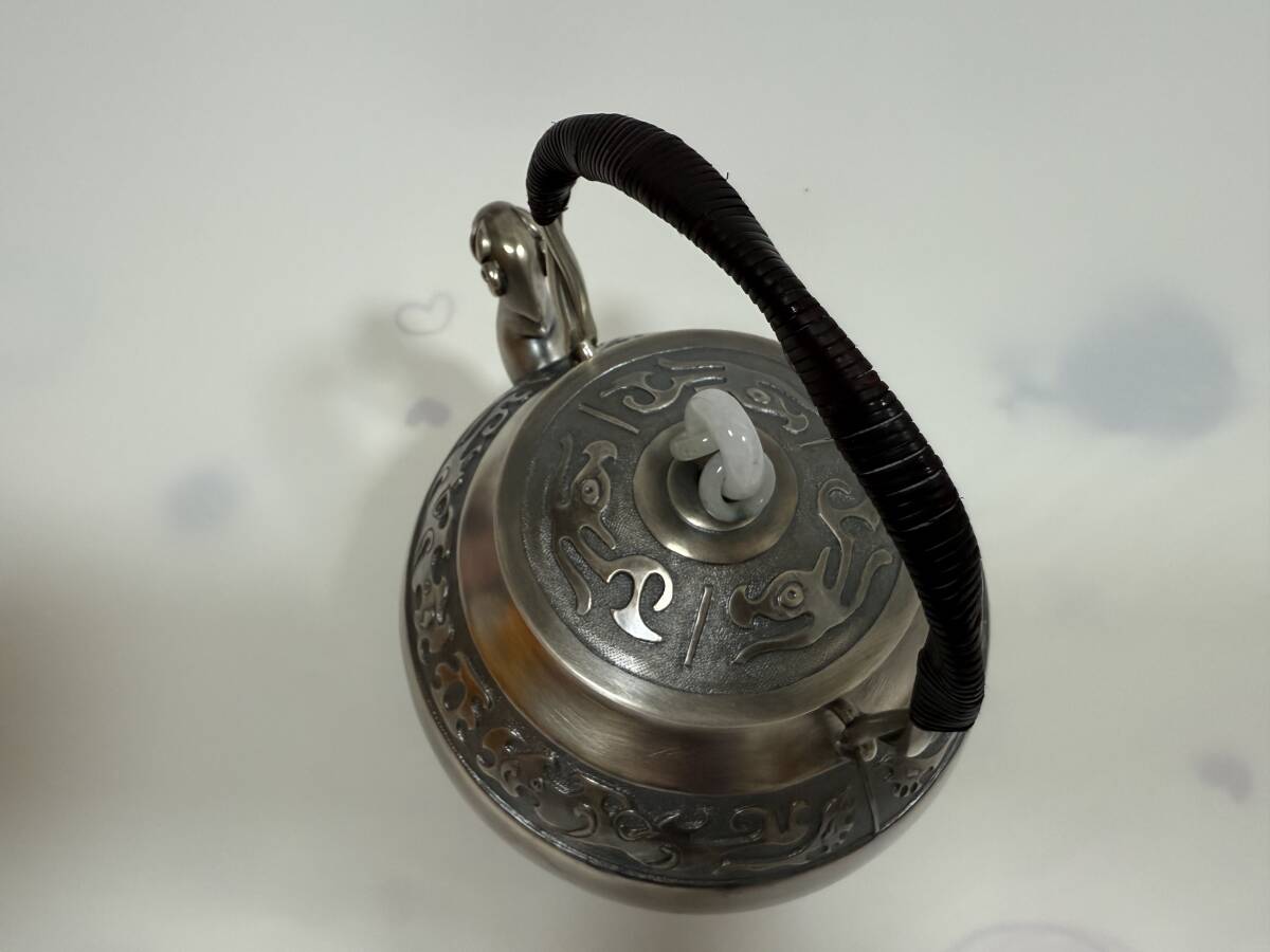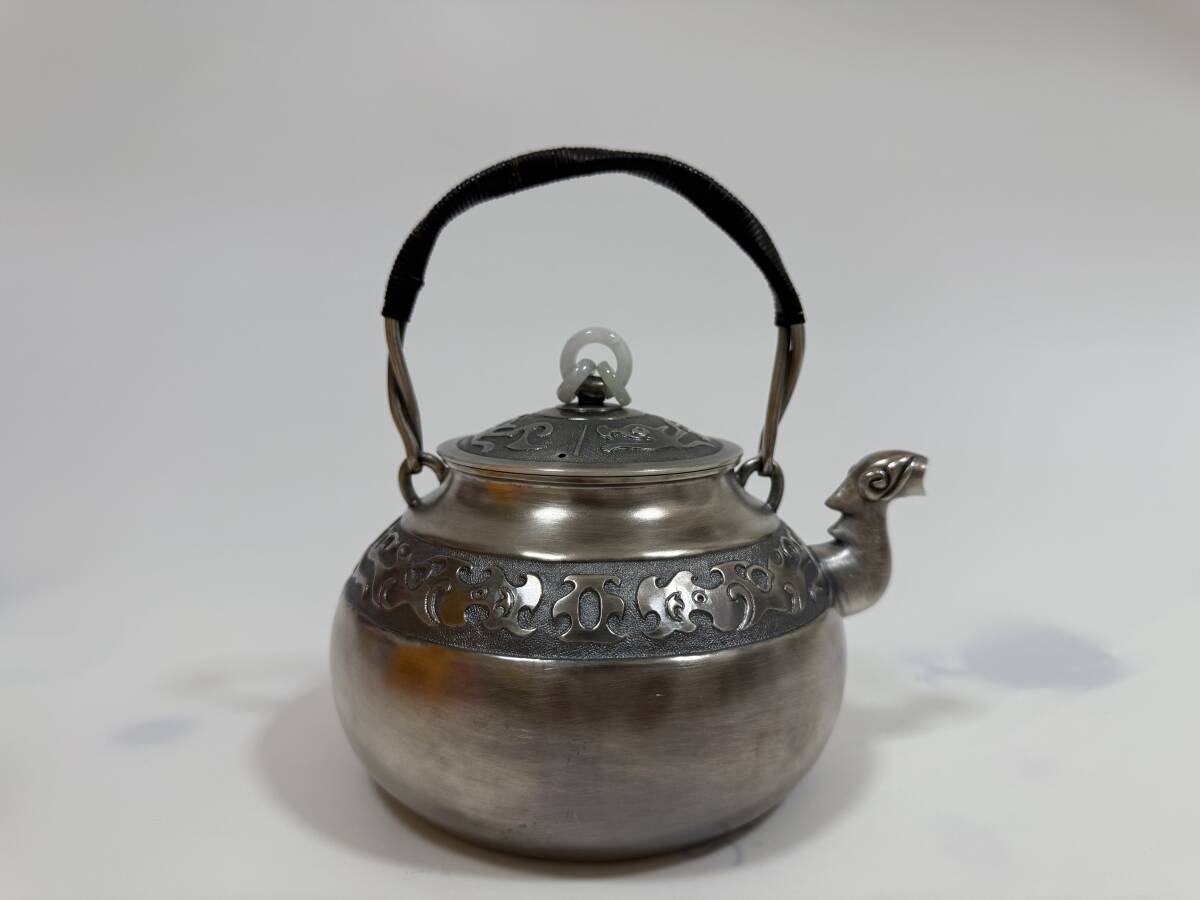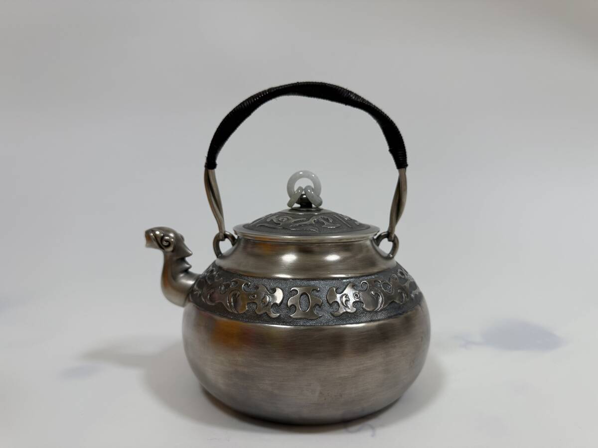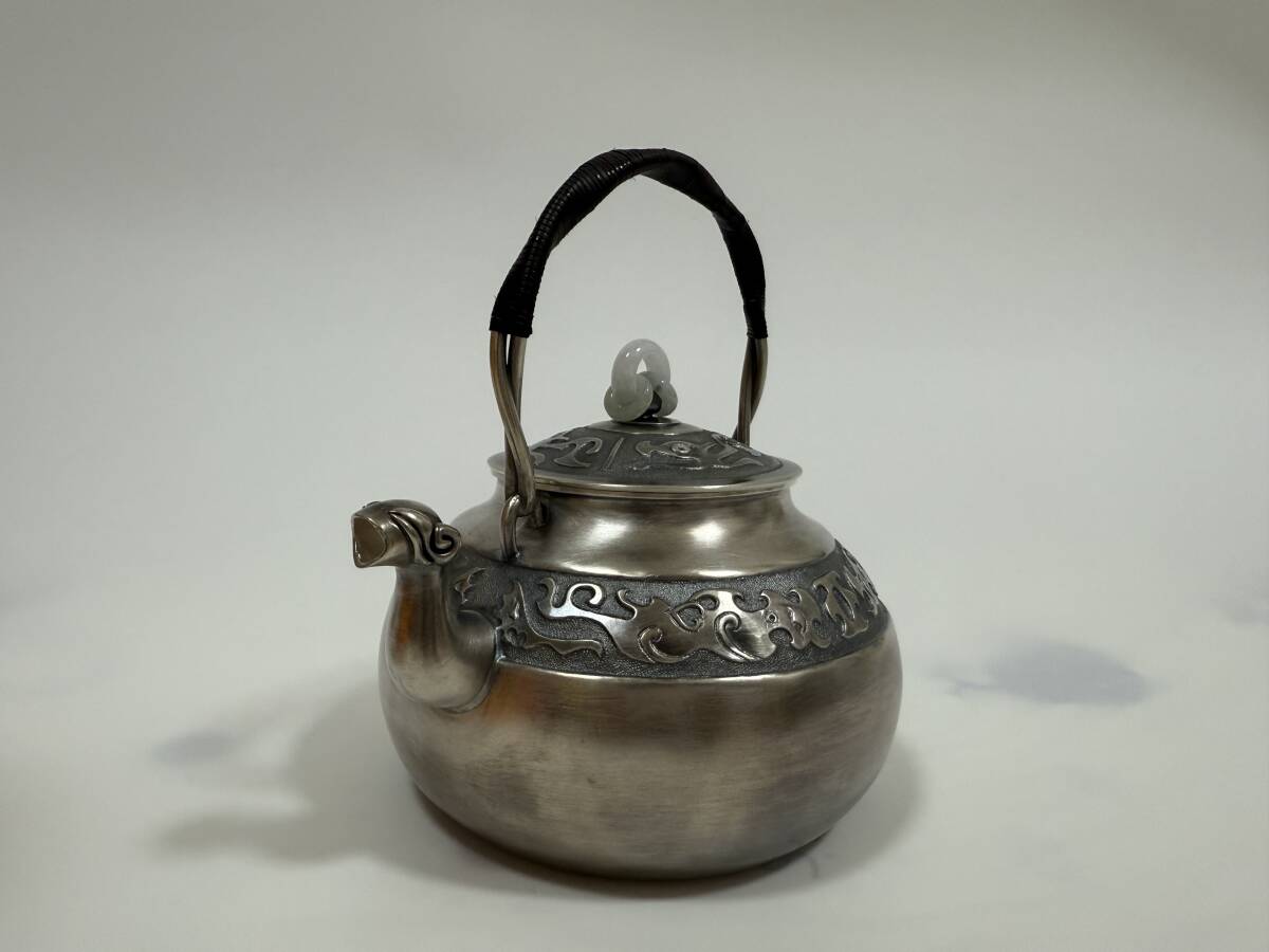 時代 純銀製 蔵六居造 饕餮紋 玉摘 獣口湯沸 工芸品 古美術品 銀瓶 煎茶道具
