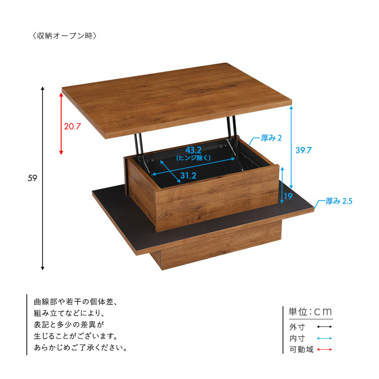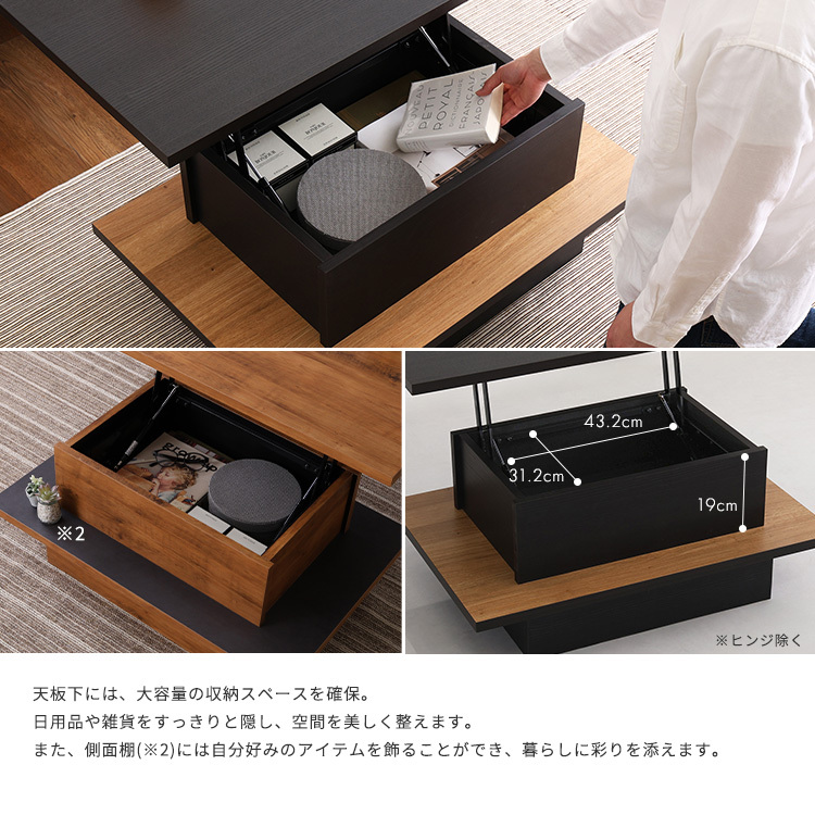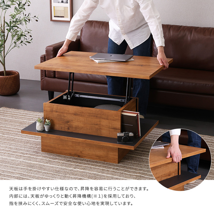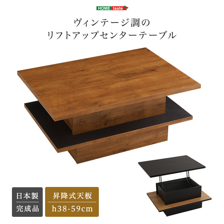 ヴィンテージ調のリフトアップセンターテーブル シャビーオークブラック