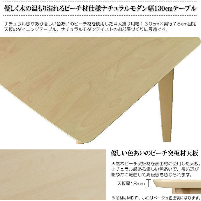 | 【商品名】 | 優しく木の温もり溢れるビーチ材仕様ナチュラルモダン4人掛け用幅130cmダイニングテーブル | |