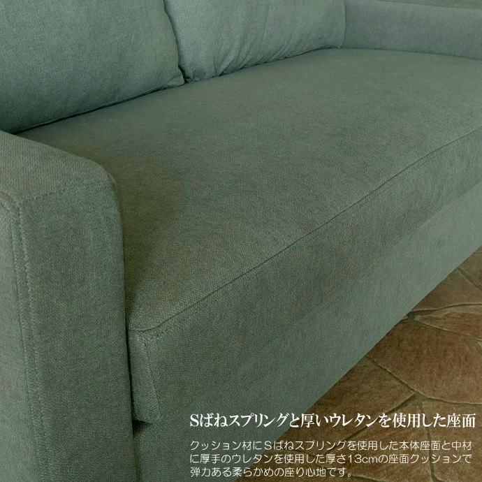 | 【商品特徴】 | ・幅130cm×奥行75cmのコンパクトな2人掛けサイズです。 ・張地に、さらりとした肌触りのファブリック布地を使用。落ち着いた濃いグレー色の張地です。 ・座面・背もたれのクッションは、マジックテープ留めで簡単に脱着できる置きクッションタイプ。移動や設置も楽にできます。 ・本体の座面にSばねスプリングを使用して、弾力ある柔らかめの座り心地です。 ・背もたれは、本体にウェービングベルトを使用してクッション詰物にシリコンフィルを使用したふんわりとしたフィット感ある掛心地です。 ・立ち上がりやすくフォーマルな雰囲気もある肘付。和風・洋風どちらの雰囲気にもあわせやすいベーシックなデザインです。 ・合成樹脂の脚が付いて、ソファー下には約11cmの空間があります。通気性が良く、お掃除ロボットもご利用ができソファー下のお掃除も楽にできます。(お掃除ロボットの機種により異なります。) ・脚底にフエルトが付いて、床を傷つけにくくなっています。 ・お客様で脚のお取り付けが必要となります。ネジ式の4本の脚を、座面裏の穴にねじ込むだけです。 | |