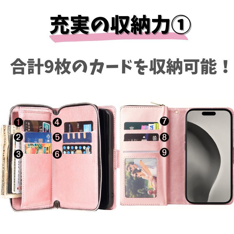 お財布としての機能もあり、収納ポケットには折りたたみ紙幣を入れることができ、コインケース 、キーケース 、 領収書入れ としても利用可能。さらに全体を収納できるファスナー付きなので、大切なものを落とす心配もなく、安心して持ち運び可能です。