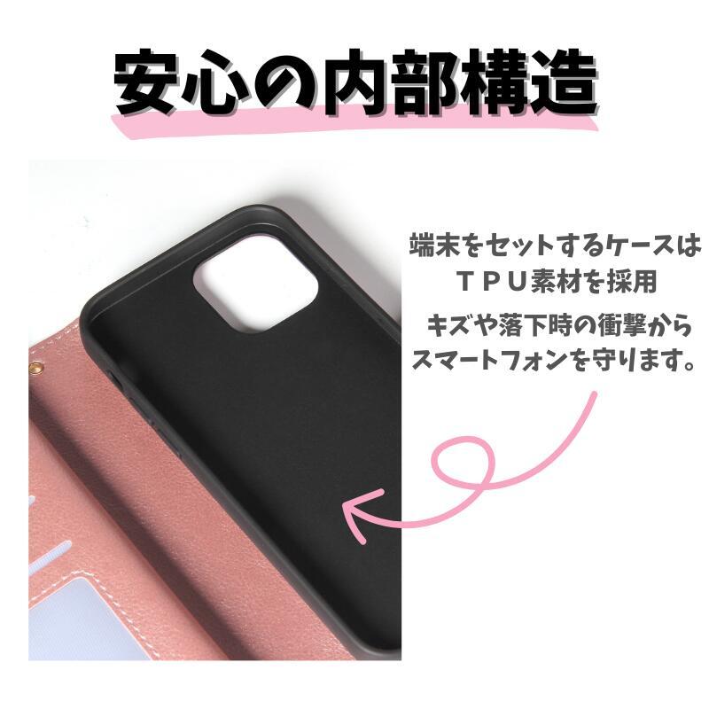 外部は上質なPUレザーを採用し、 ふわふわな質感で、手にしっかりフィット。 内部は柔らかいTPU材質を採用し、本体への衝撃を緩和させる仕様で、キズや衝撃から大切な携帯をしっかり保護
