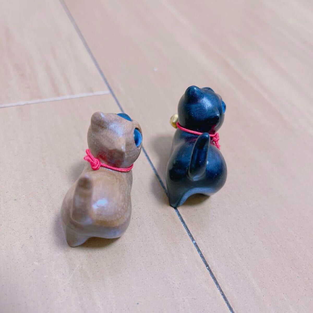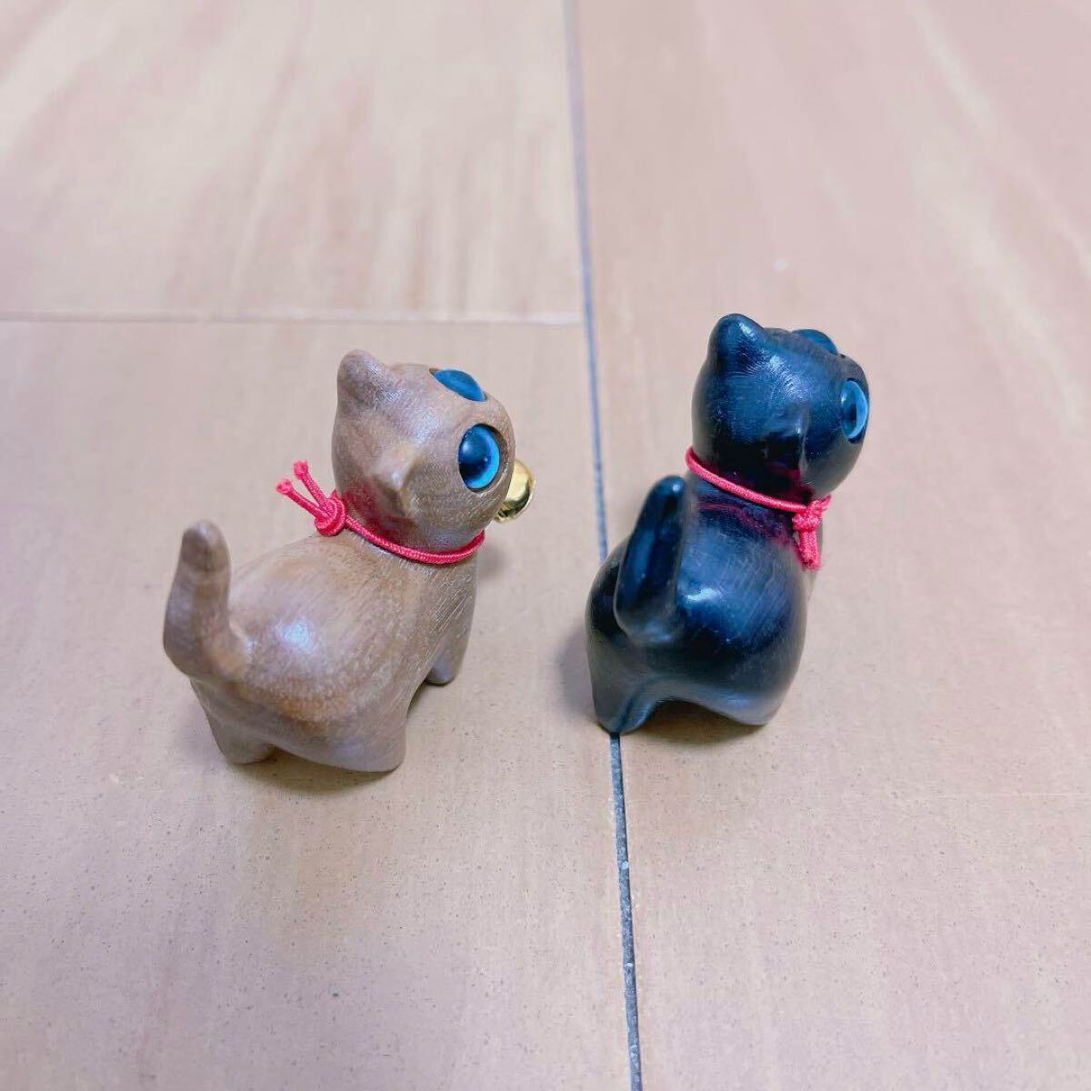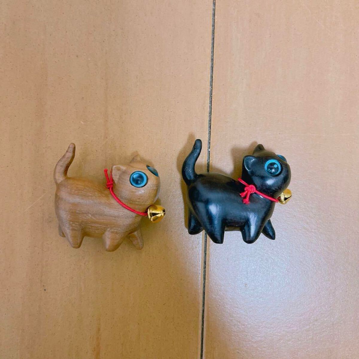 大きな瞳が可愛い木彫りの猫の置物2点セット!