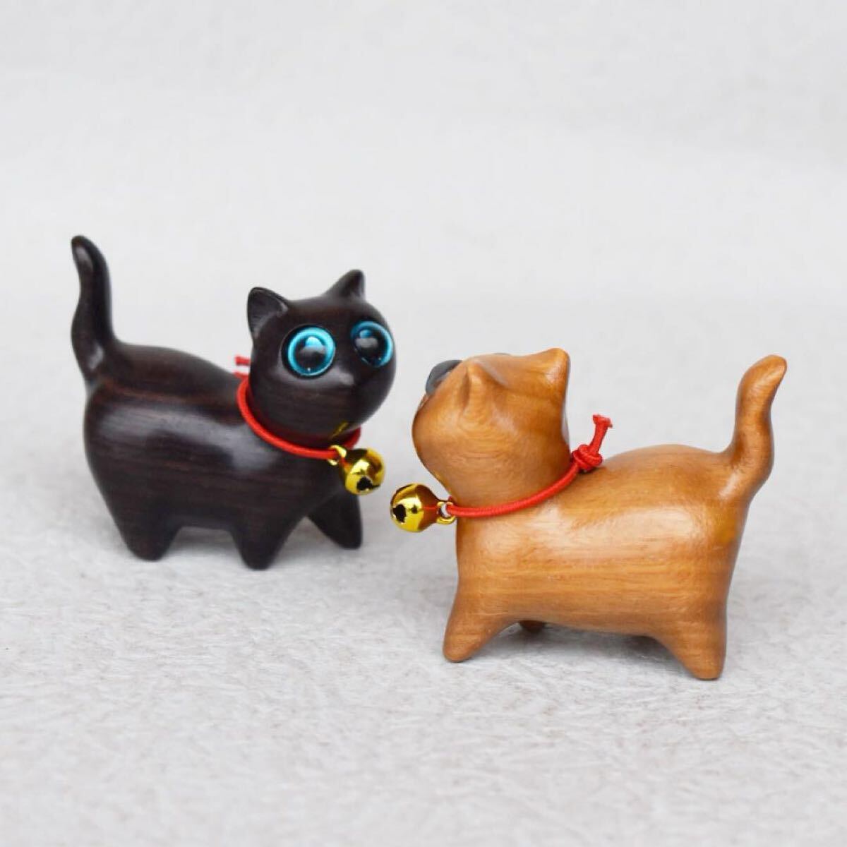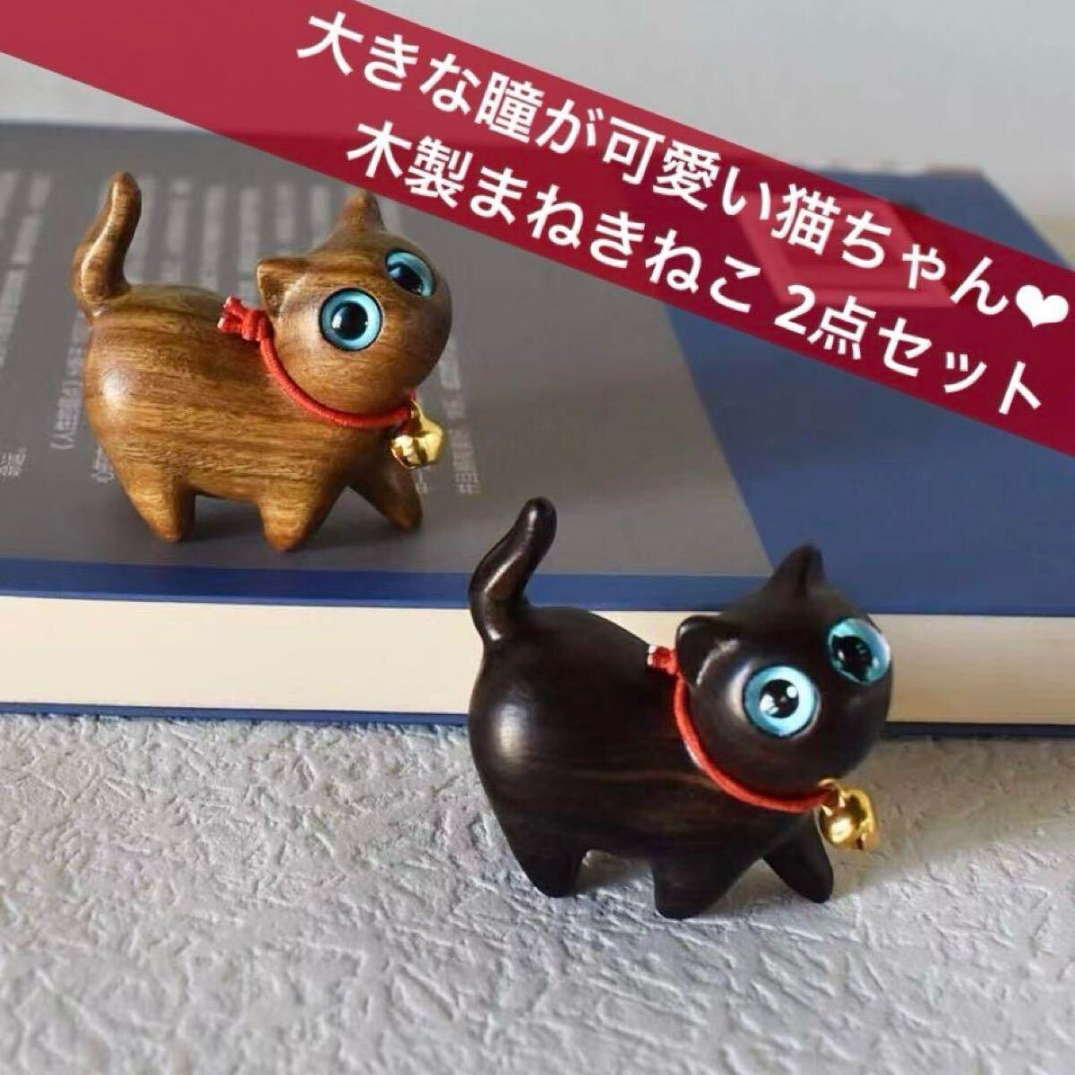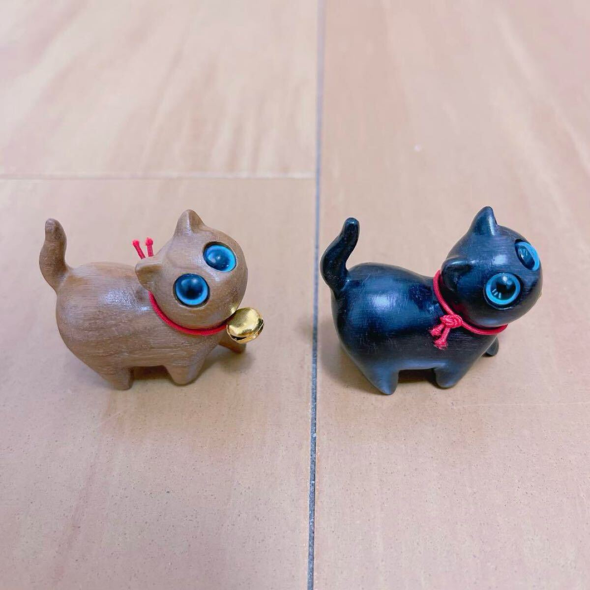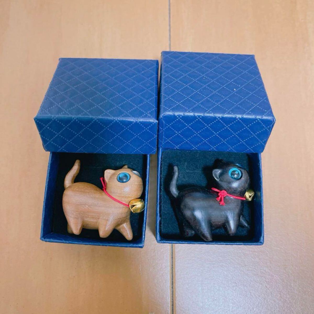 大きな瞳が可愛い木彫りの猫の置物2点セット!