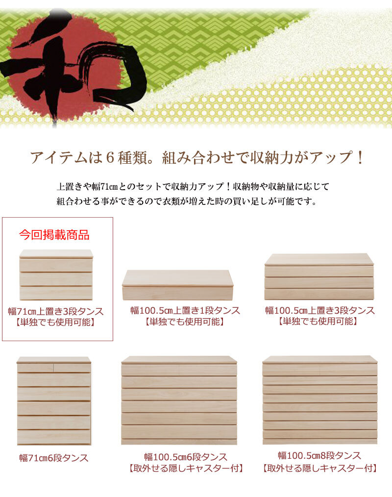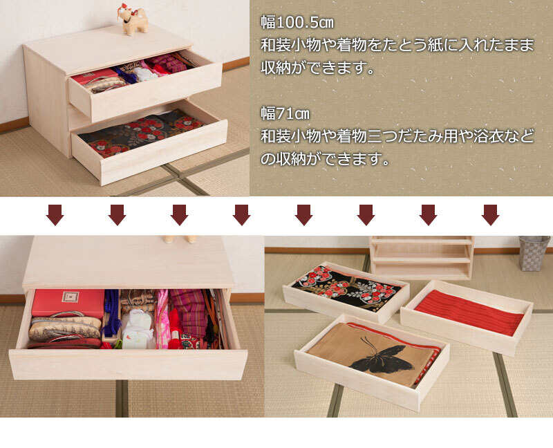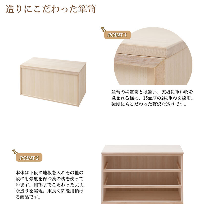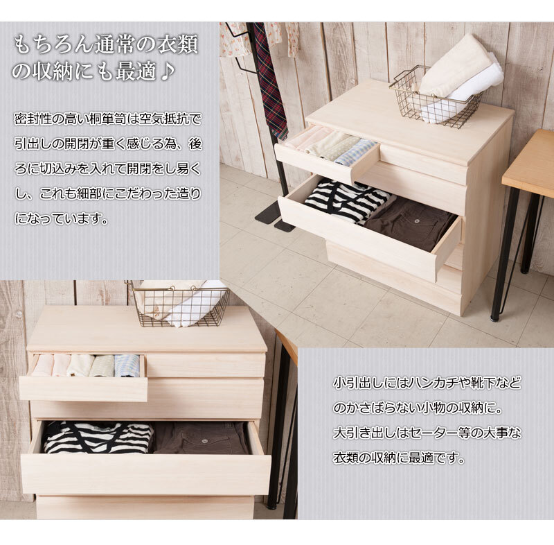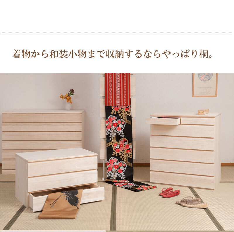 ■商品について/取っ手金物を排除し桐箪笥の概念を覆したモダンな印象の桐箪笥シリーズに三つ折り着物・帯・小物収納に最適なサイズが登場。和室はもちろん、洋室にも合うこだわり設計。桐の素材の風合いをそのまま活かした生地仕上げ、緩やかな木目を生かしたナチュラル、ブラウンカラーの3タイプをご用意。多段のラインからできる影は見てるだけで心地いい。通常の桐箪笥とは違い、天板に重い物を載せれる様に、15mm厚の2枚重ねを採用したところもこだわりポイントです。桐材は着物や浴衣、洋服など長期保管に最適です。