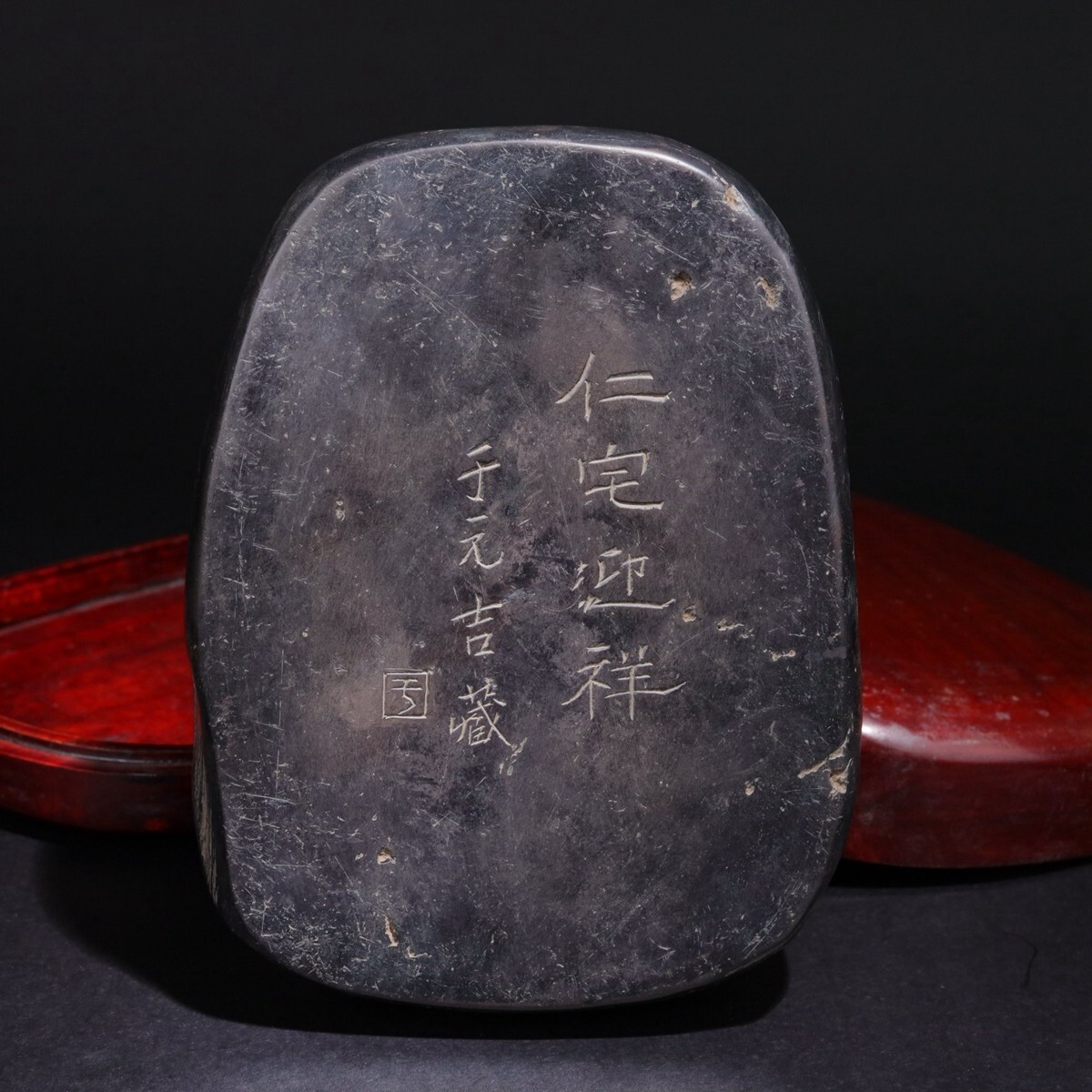 清代 麻坑端石彫 五彩釘薔薇紫文房端渓硯 于元吉銘【仁】手彫り 文房具 書道具 中国古硯 蔵出 骨董