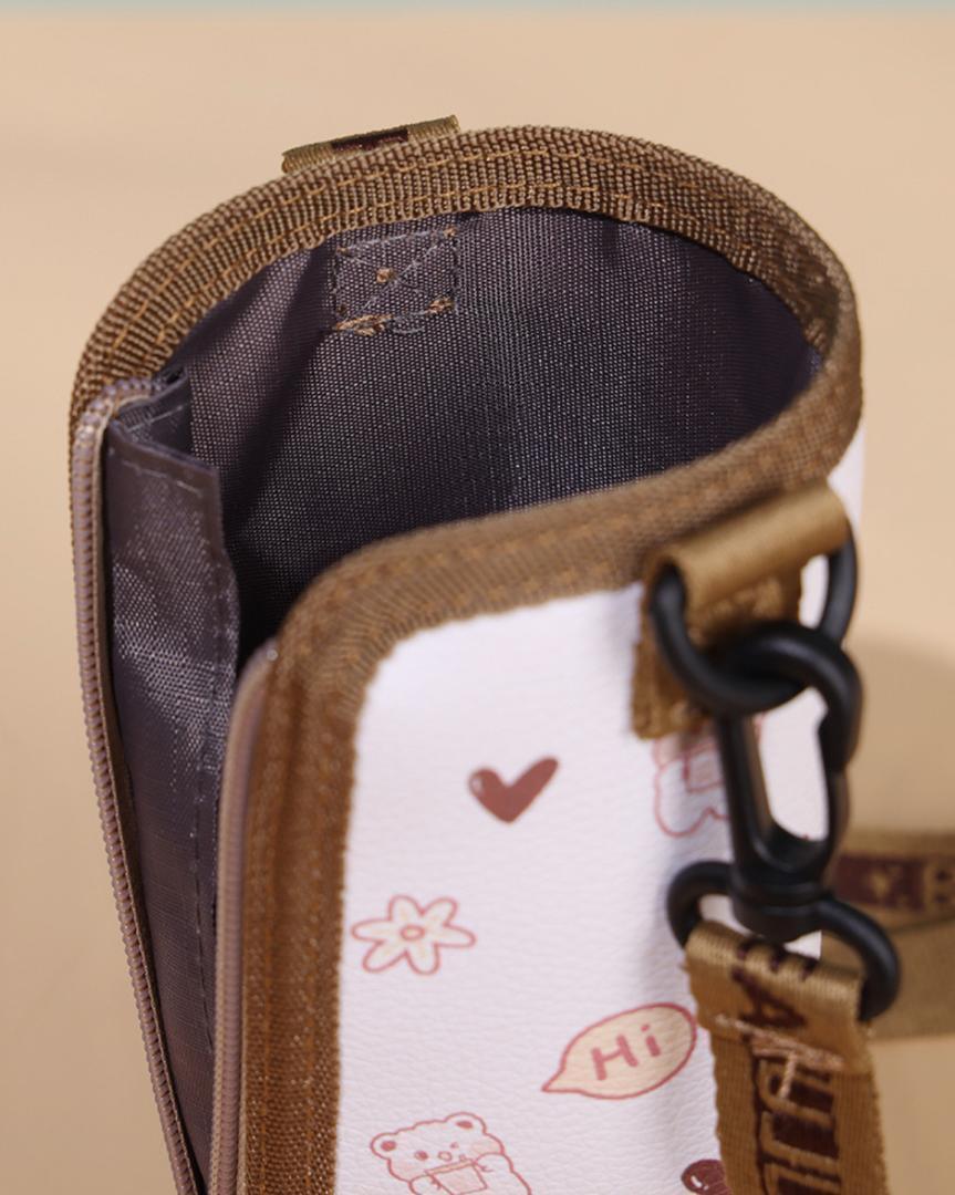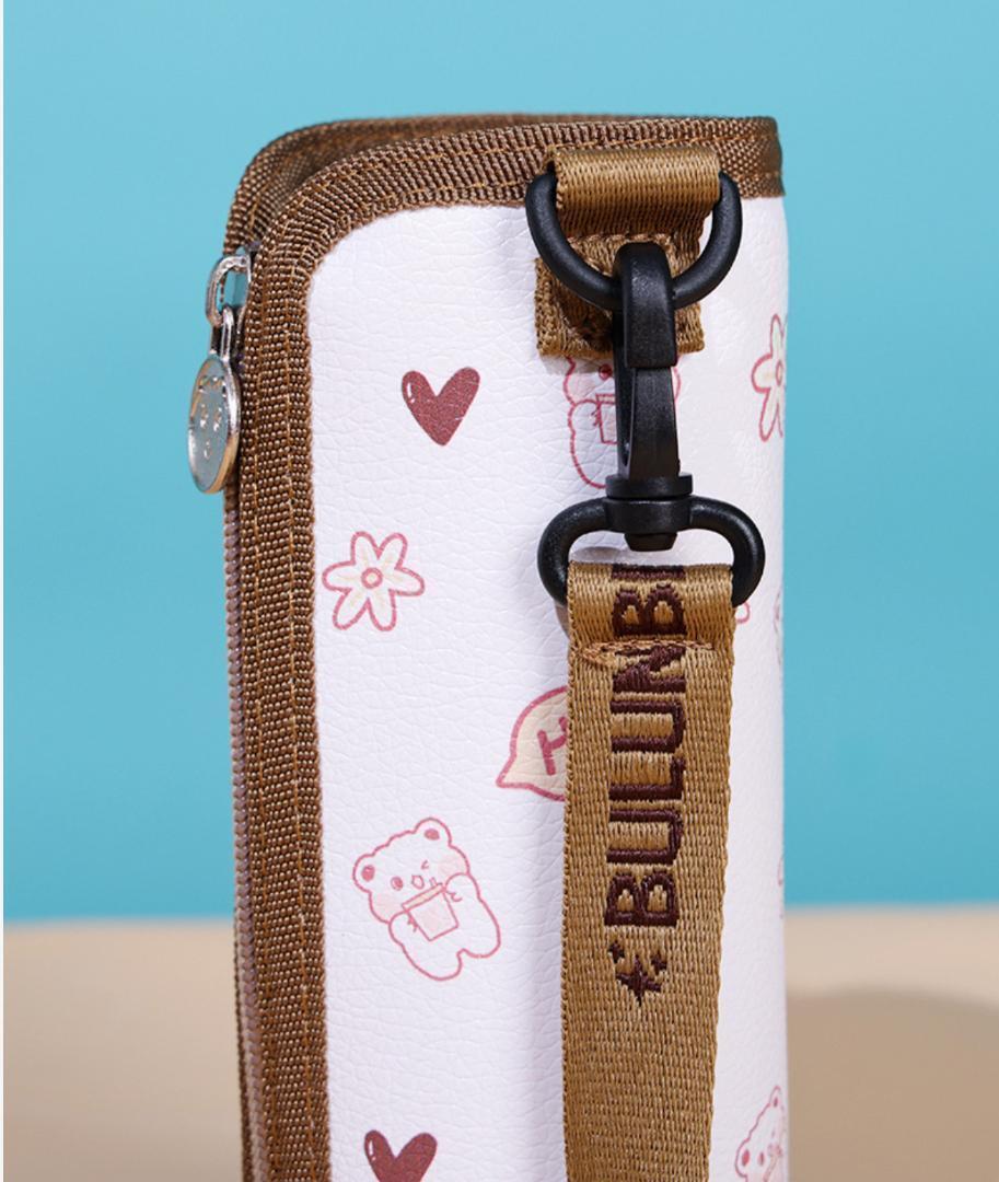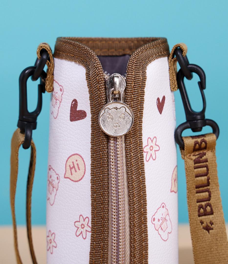 この水筒カバーは、外生地に水や汚れに強いPU革を使用し、内生地には耐久性に優れたポリエステル生地を採用しています。