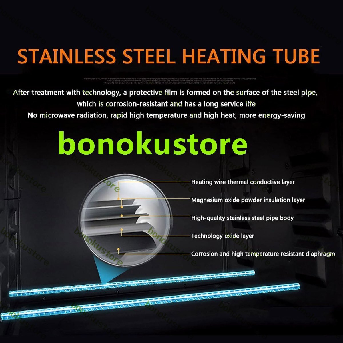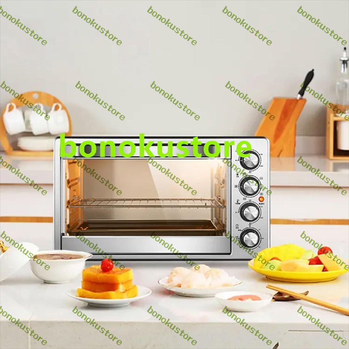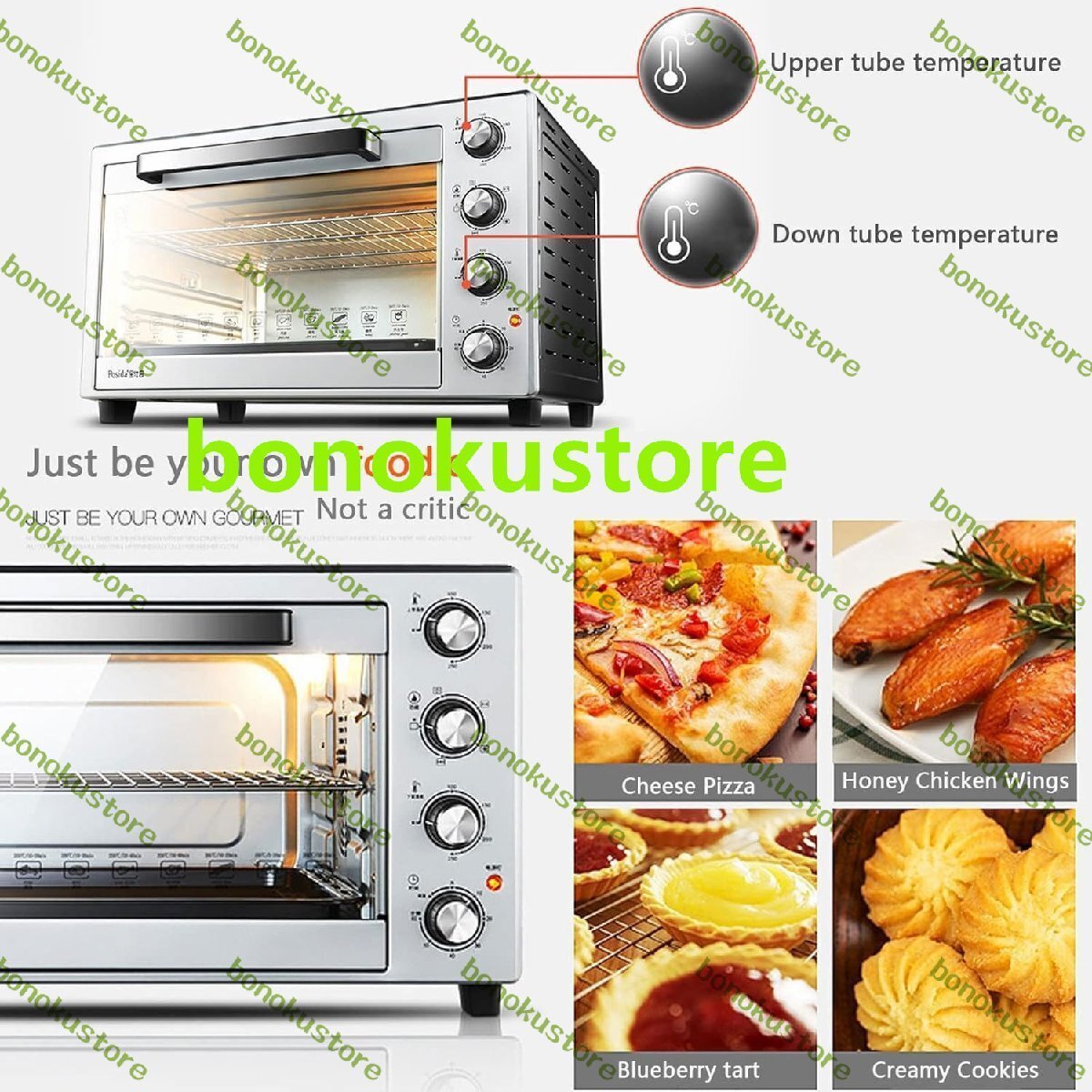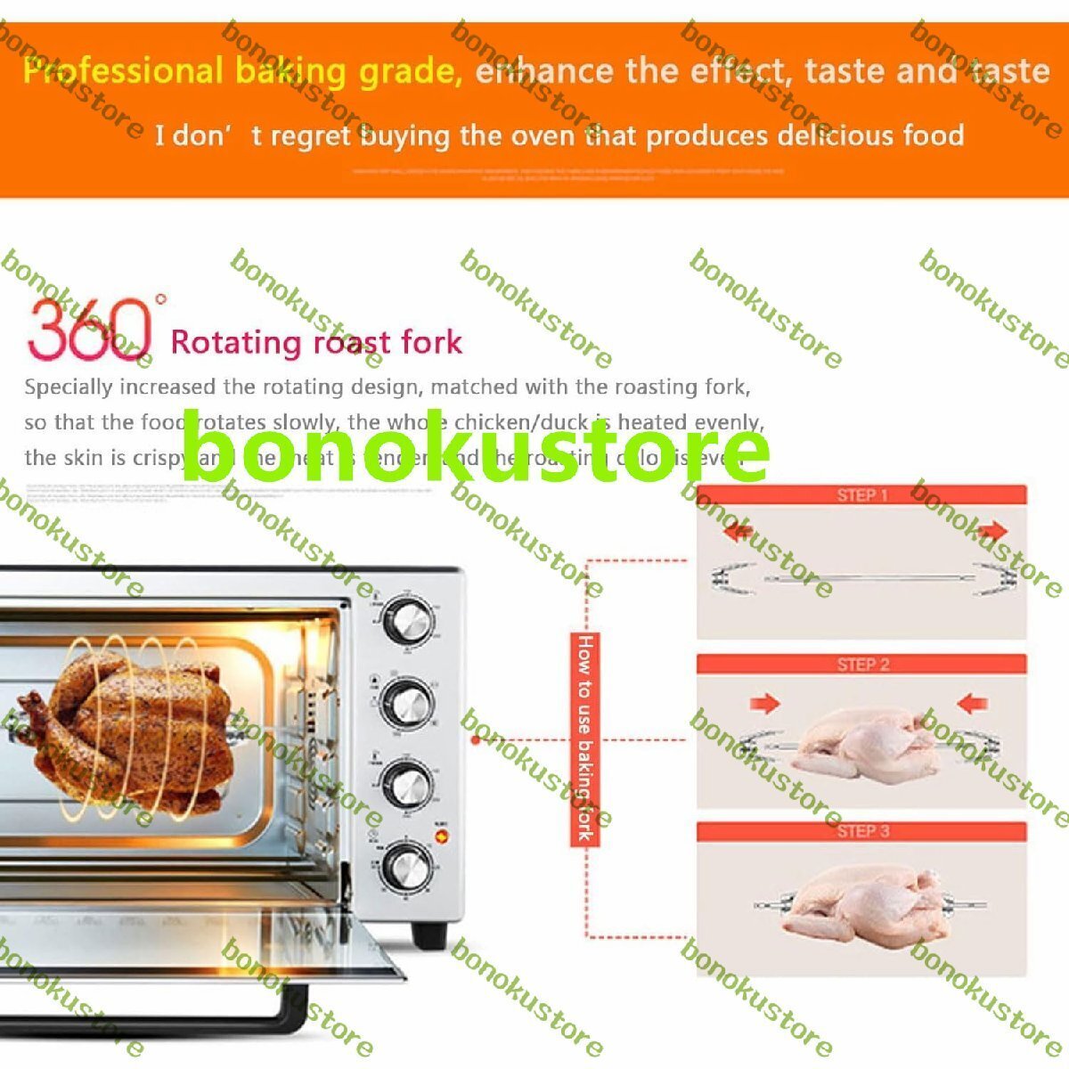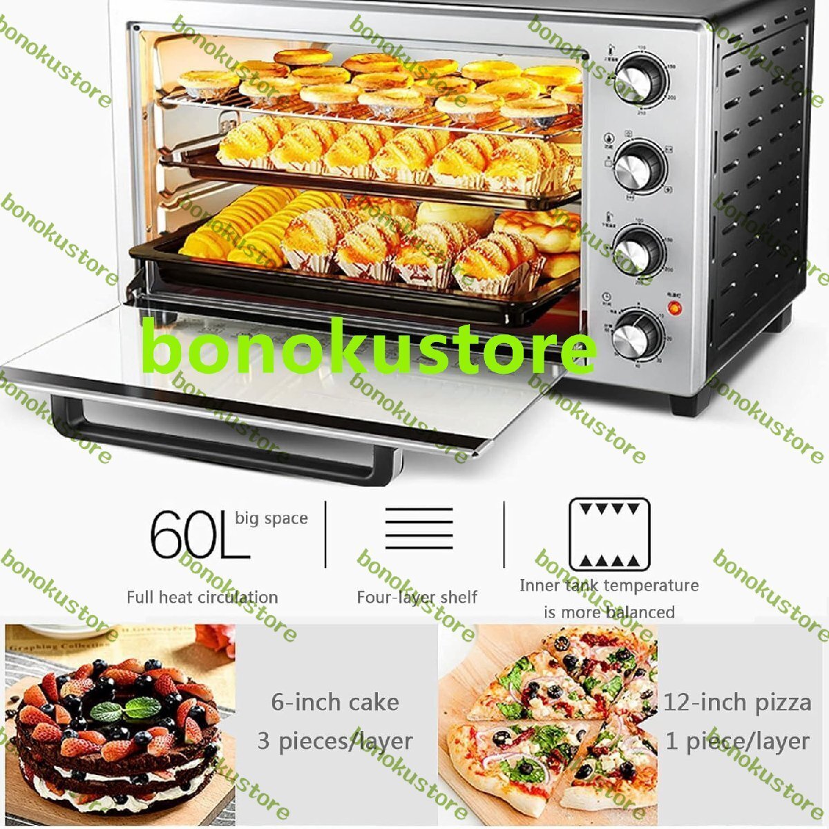 デスクトップ60L商業ピザオーブン、1800W電気ステンレス鋼ベーキングオーブン、360°回転グリルフォーク付き、高温耐性照明付き、ステーキ、七面鳥、ローストダック、パン用