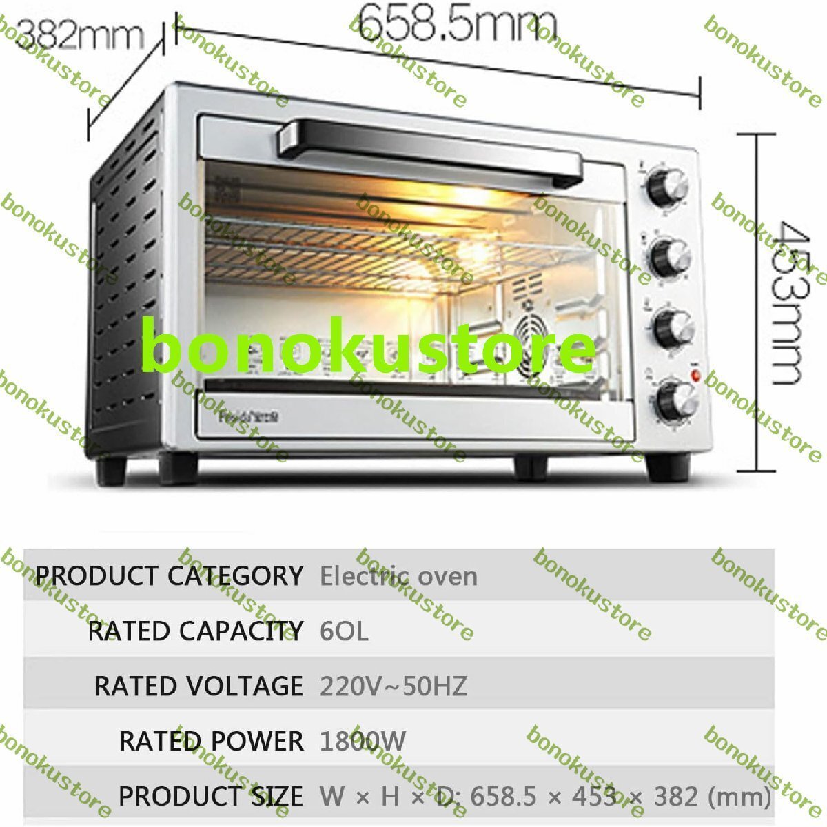 名前: 電気オーブン 定格電力: 1800W 製品容量: 60L 寸法: 382x658.5x453mm パック: 1x オーブン 1x グリル 1xベーキングパン 1x ベーキングフォーク 2x フェッチラック 1x取扱説明書