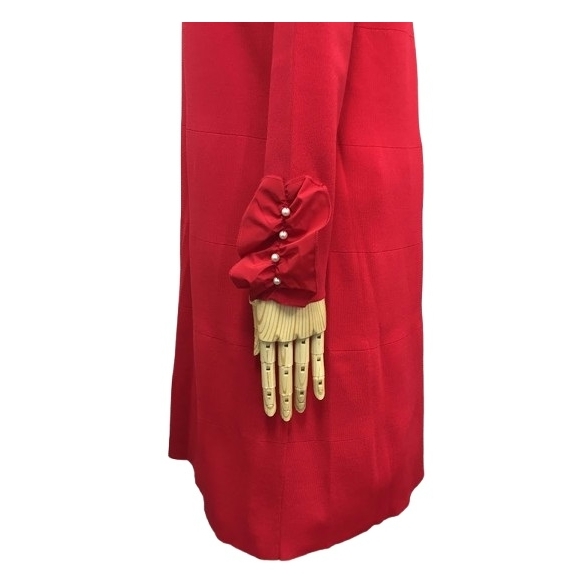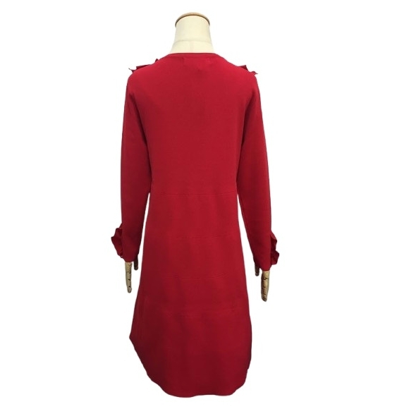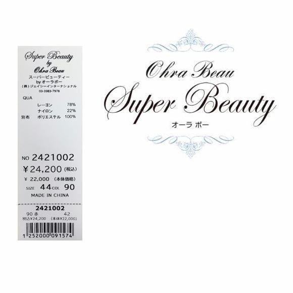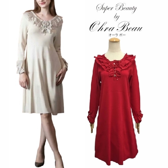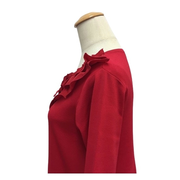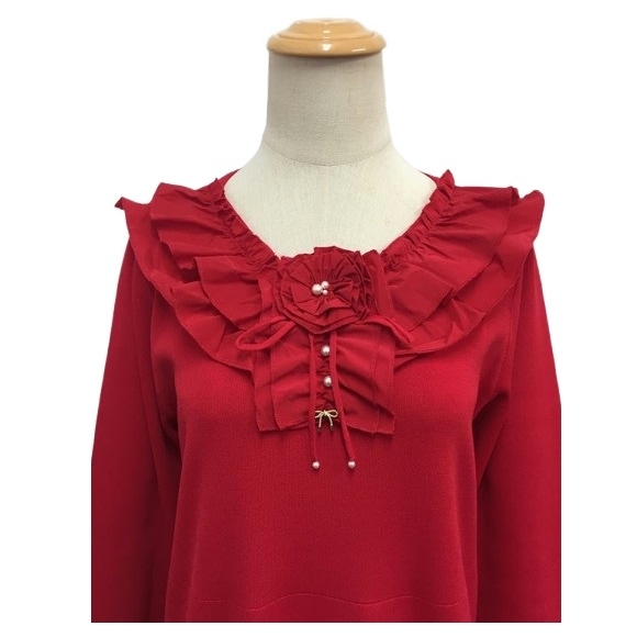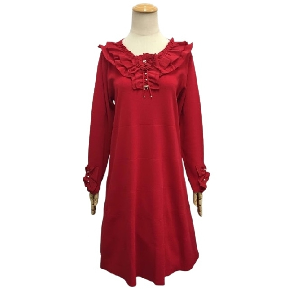 スーパービューティー 44 ワンピース 襟ぐりフリル デザイン ニットワンピ 2421002 レッド LL 2024年春夏 オーラボー 大人かわいい ミセス