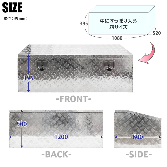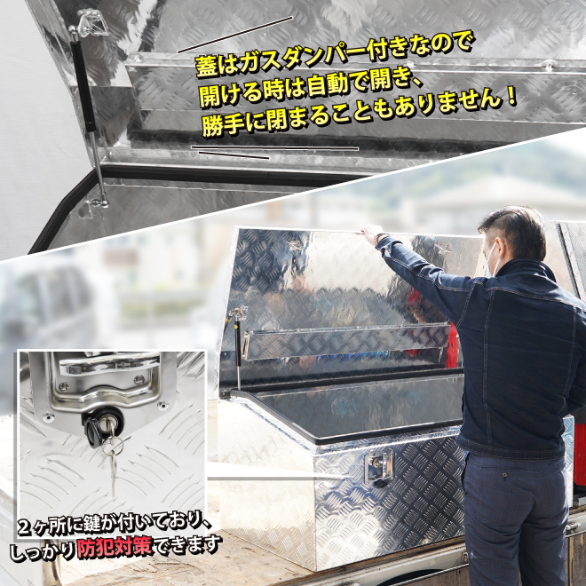 ●高い耐久性をもつ頑丈なアルミツールボックスです ●DIYなどの工具の収納など、幅広い用途に活用できます ●防水構造なので、トラックの荷台や軒先、お庭などの屋外にも最適です ●アルミ製で非常に軽く自動車に取り付けても燃費が悪くなりません ●大きな工具も収納できる、大型サイズです ●正面2ヶ所に鍵が付いており、安心です(鍵はそれぞれ2個ずつ、左右共通です) ●鍵穴にはカバーが付いています ●ハンドルロック式でしっかり施錠でき、 ハンドルは折りたためるので、見た目もスッキリしています ●蓋はガスダンパー付きなので開ける時は自動で開き、勝手に閉まることもありません ●オープナーはステンレス、鍵穴はスチールです |