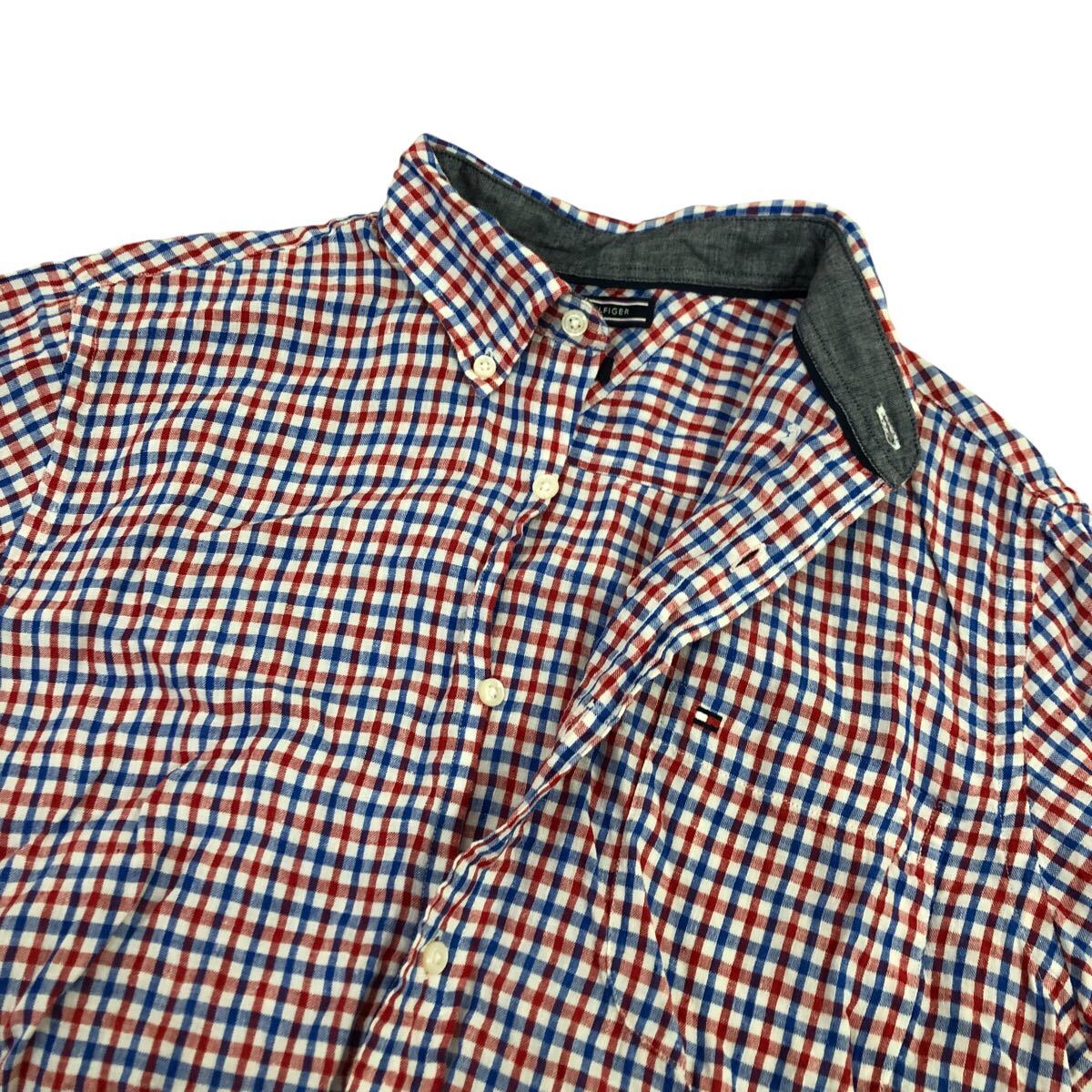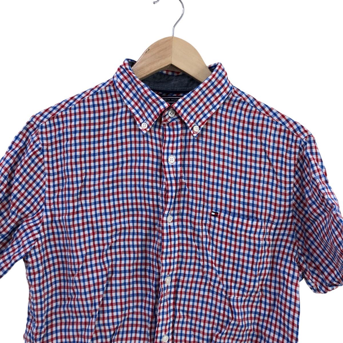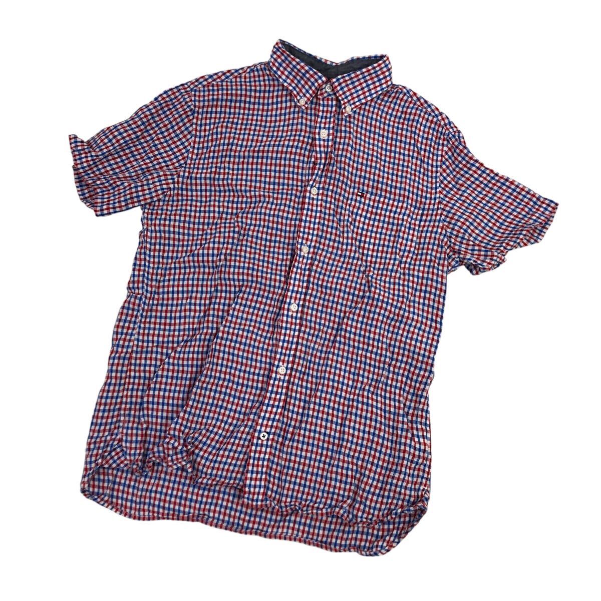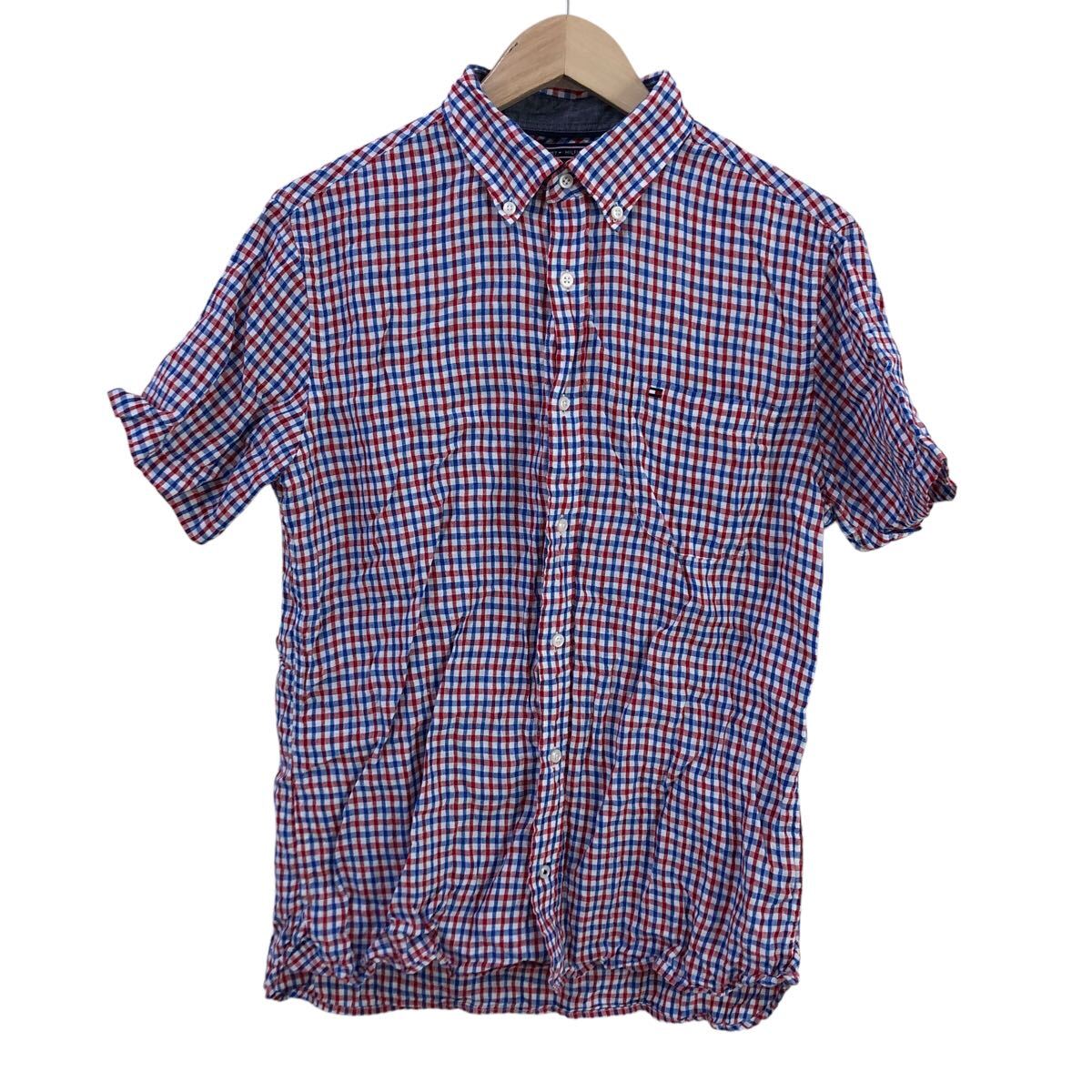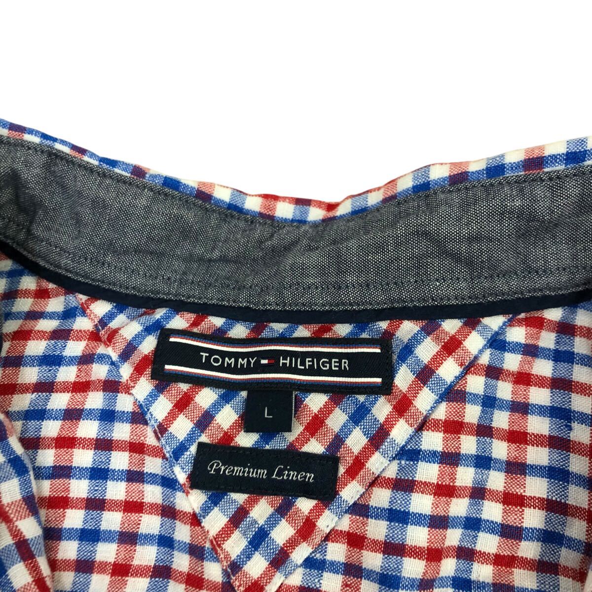 ND276-21 TOMMY HILFIGER トミーヒルフィガー 半袖 ボタンダウン シャツ トップス 羽織り フロントボタン 麻100% レッド系 総柄 メンズ L