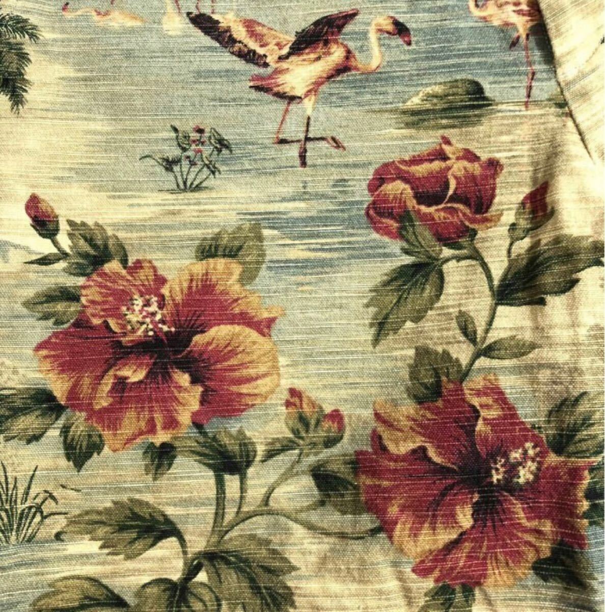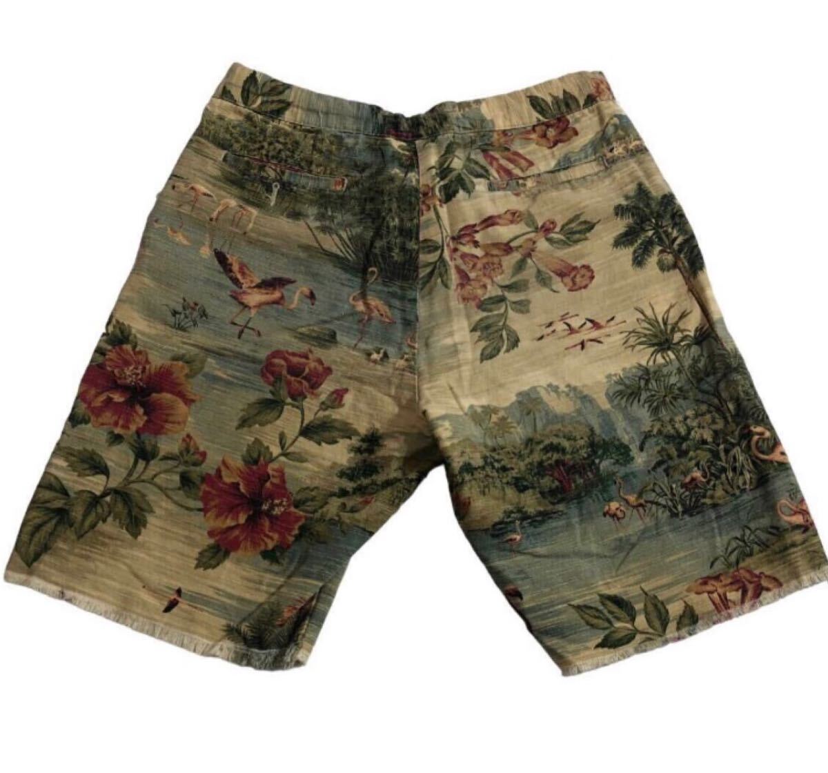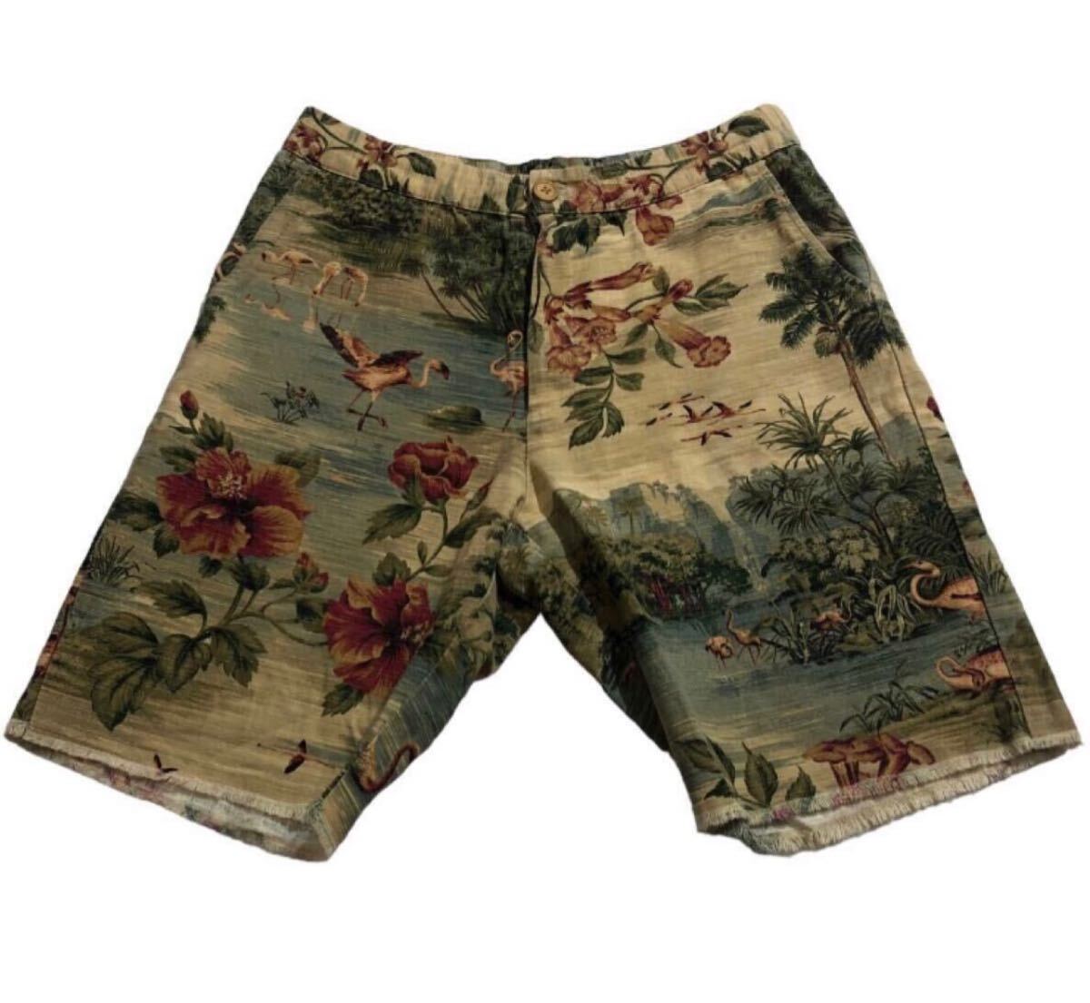 ハイビスカス×フラミンゴ×海 総柄 プリント 切りっぱなし デザイン ハーフ パンツになり大変格好良くお洒落です