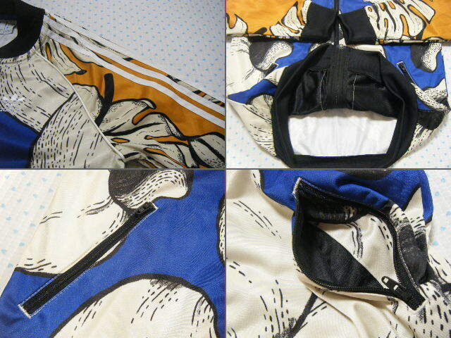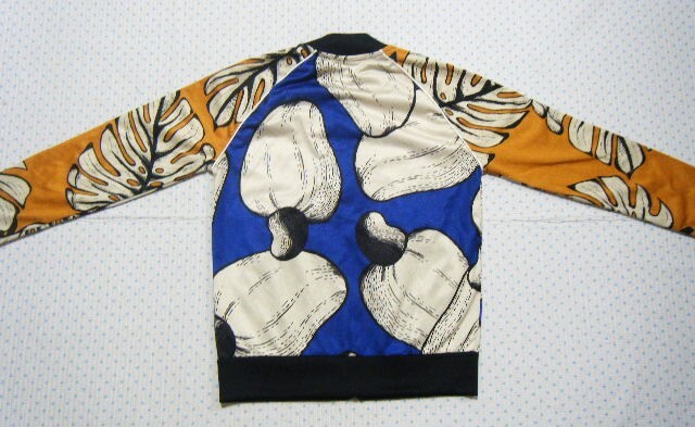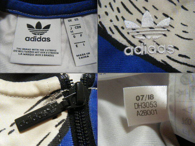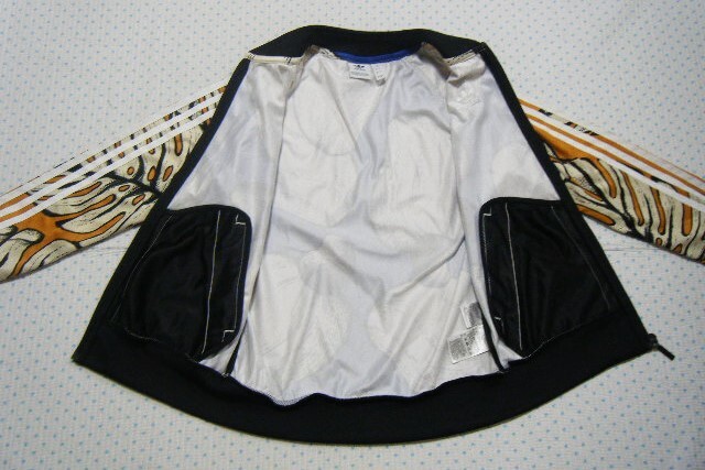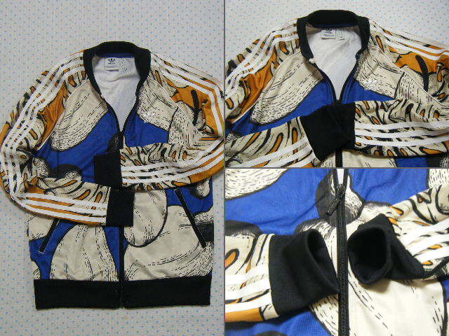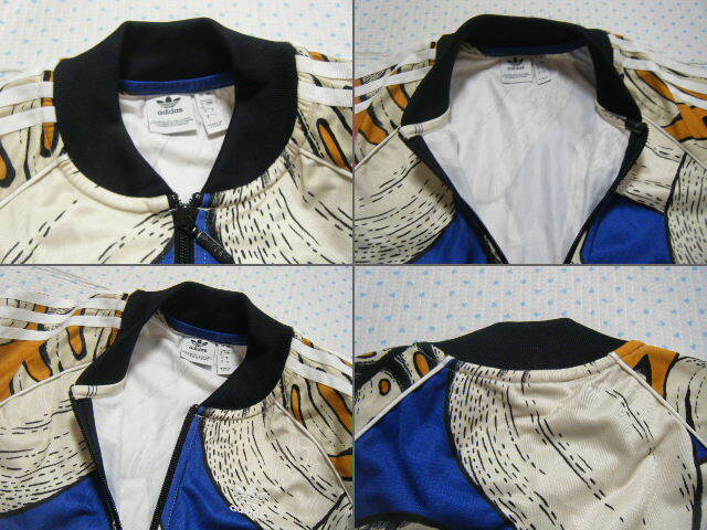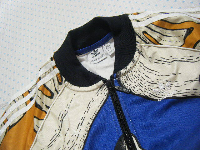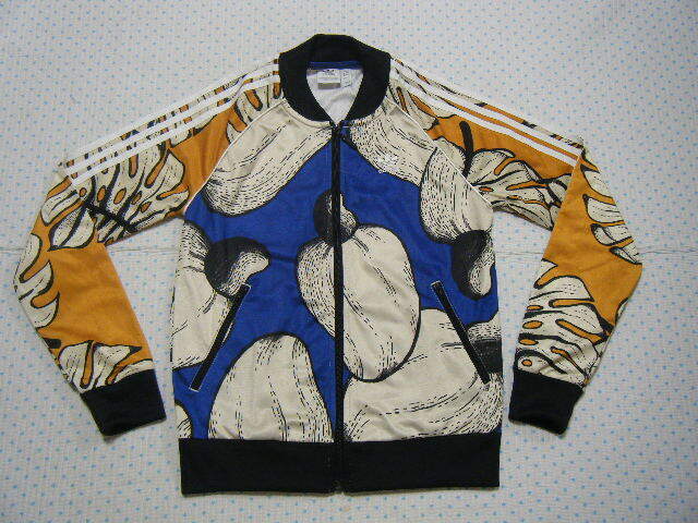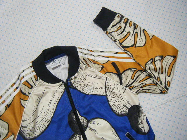 本体は軽量ポリエステル素材。  表面は少し光沢のある滑らかでスポーティーなトリコット生地に、カシューナッツとモンステラリーフをミックスしたプリントデザインを施し、裏面は起毛調に加工された生地が、肌ざわりのよい着用感を与えるカジュアルスポーツ用トラックジャケット。    フルジップモデル。     @ ブラジルのファッションブランド 「The FARM Company」 とのコラボレーションによるグラフィックデザインジャケット。     ベースボールカラー(襟)のリブ仕上げで、袖先部と裾先部もリブ仕上げ。  フロントの左右にファスナー付きポケットあり。    アディダスのロゴ文字・マークは刺繍。    襟元から袖にかけてのスリーラインは別布縫い付け。     モデル名  adidas  originals   THE FARM COMPANY SST TRACK TOP         カラー   マルチカラー 【ライトブラウン × クラウドイエロー × ブルー × ブラック】 総柄プリント