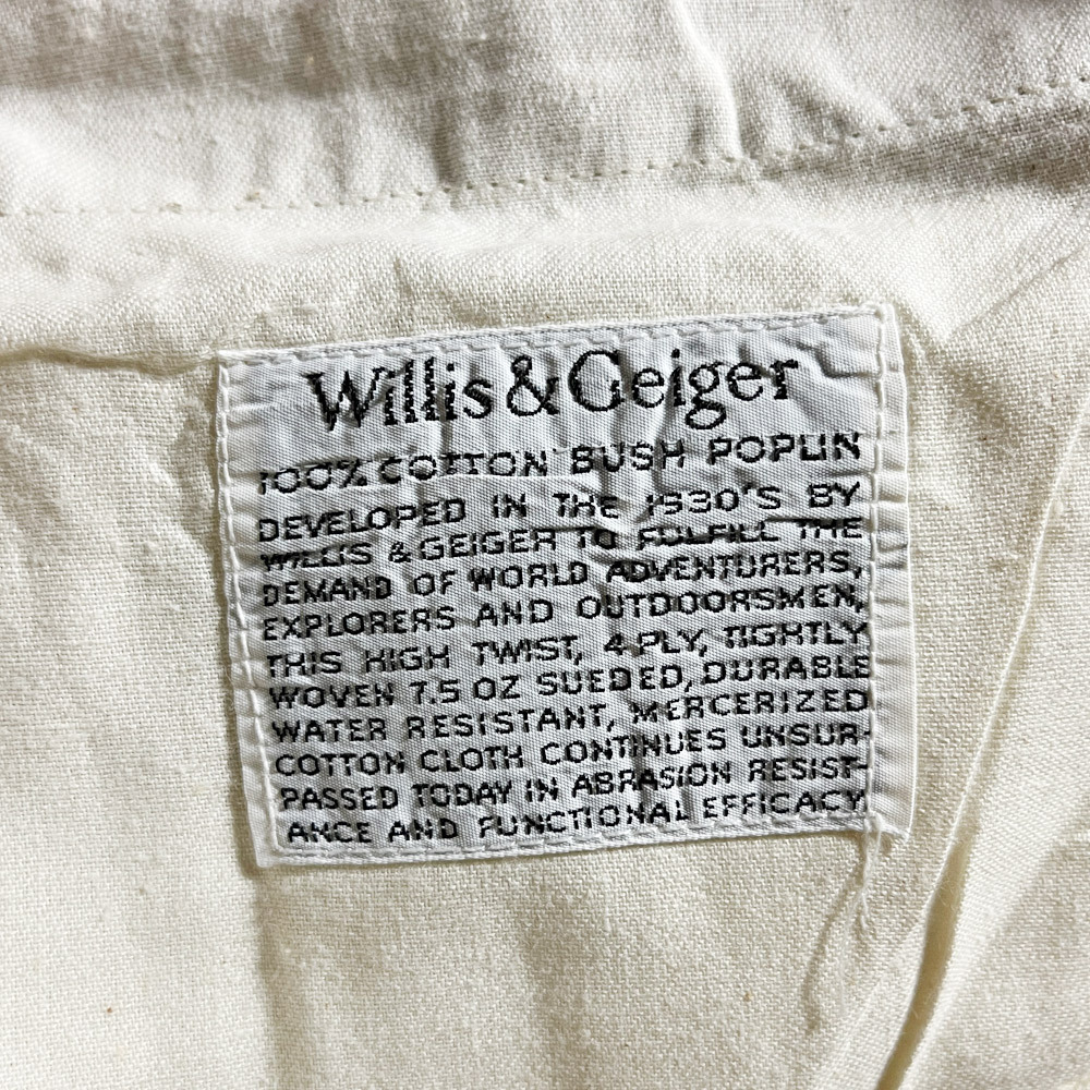 マラリア蚊から身を守る事の出来る生地「340コットン・ブッシュポプリンは「アバークロンビー&フィッチ」からの依頼を受けて、サファリ探検用衣類のためにウィリス&ガイガーが開発したものです。高密度にハイカウントで編み上げられた、軽くて丈夫な素材として、当時一躍その名を有名にした画期的な素材として認知されております。