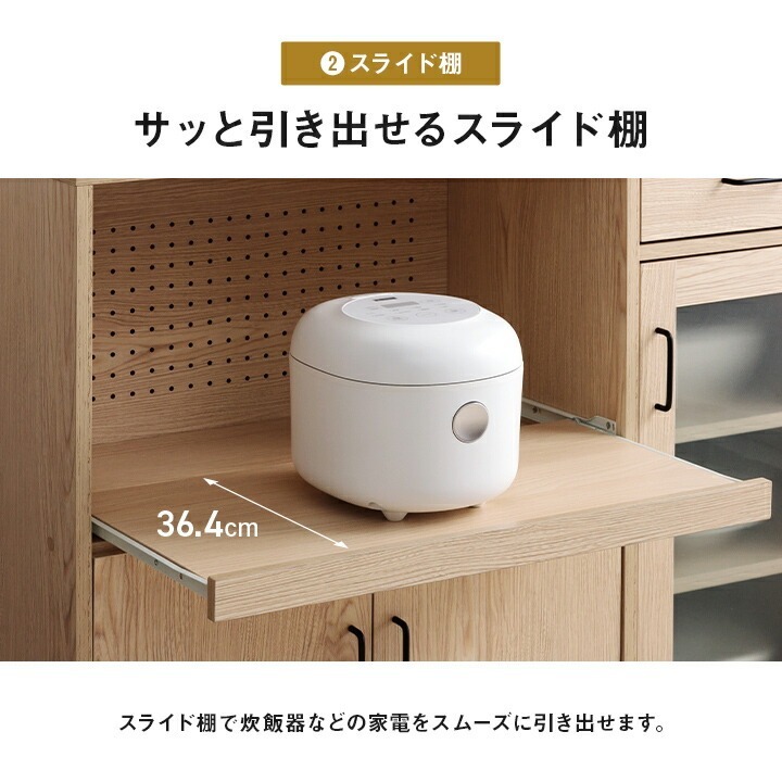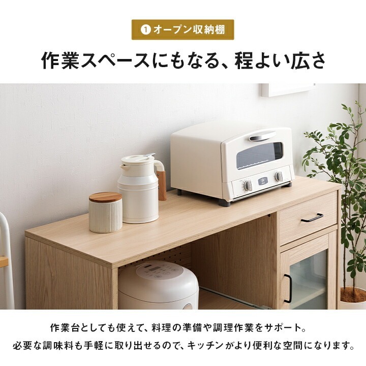 オープン収納、スライド棚、引出し収納、ガラス扉収納。