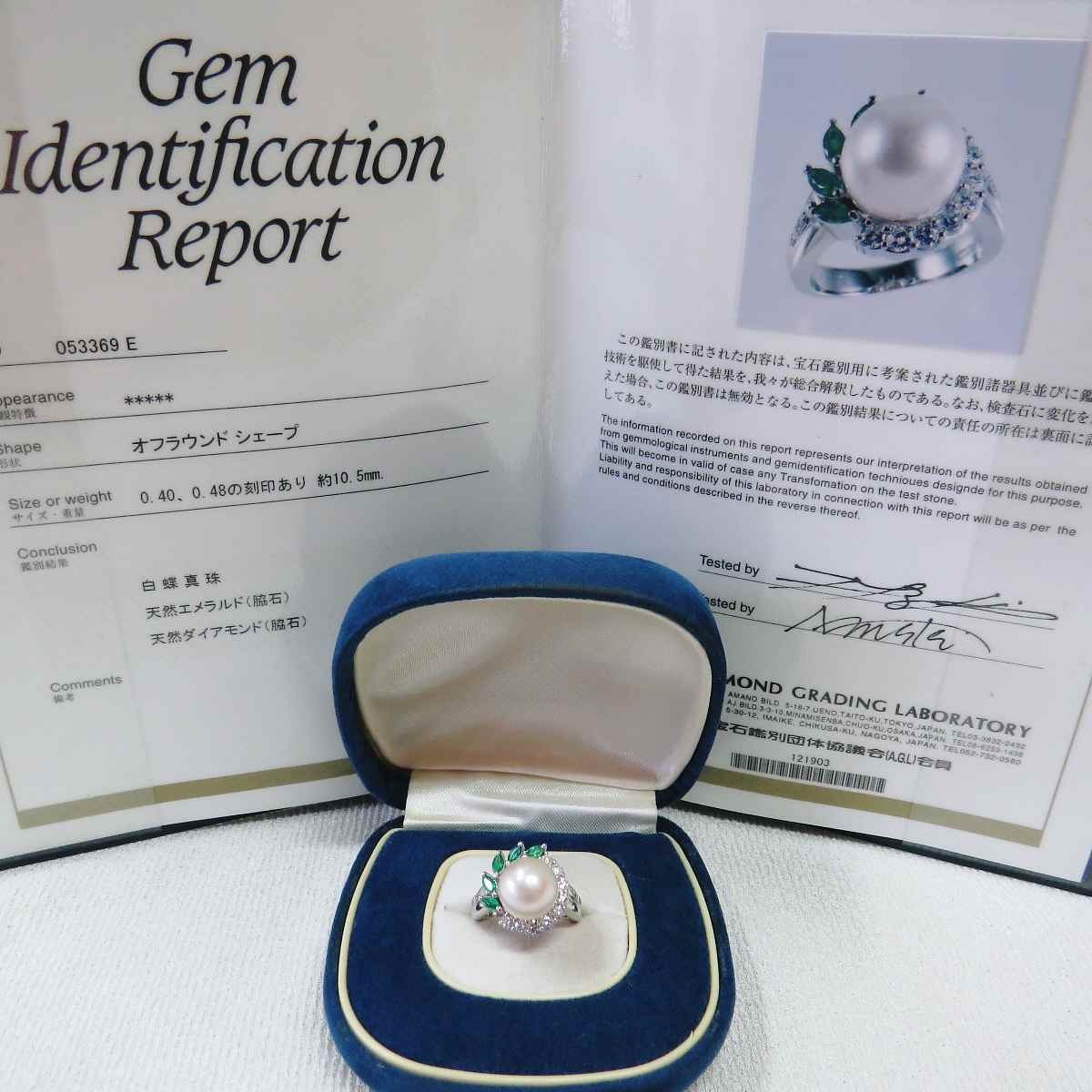 【値下げ交渉は質問欄より】真珠10,5ミリ★ダイヤ&エメラルドが取巻く素敵なPT900製リング☆鑑別書付☆#10号指輪★