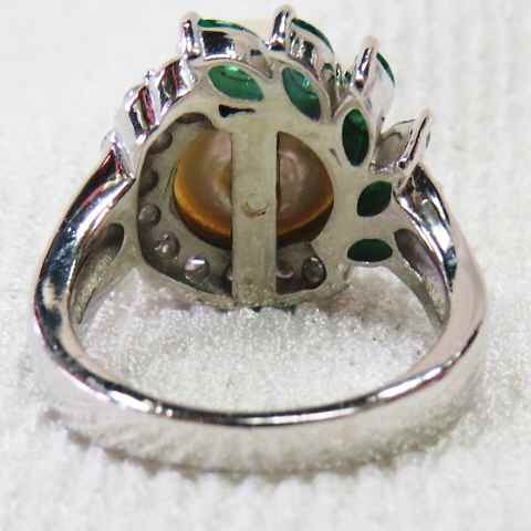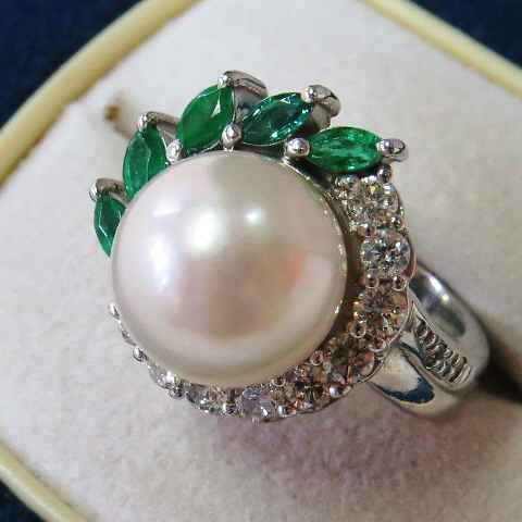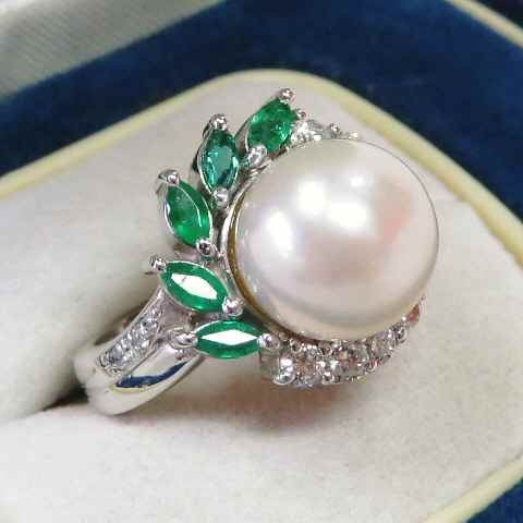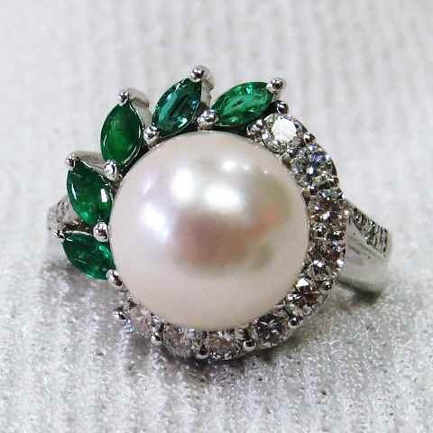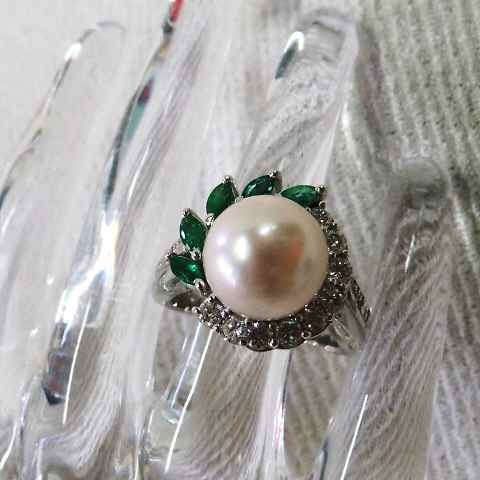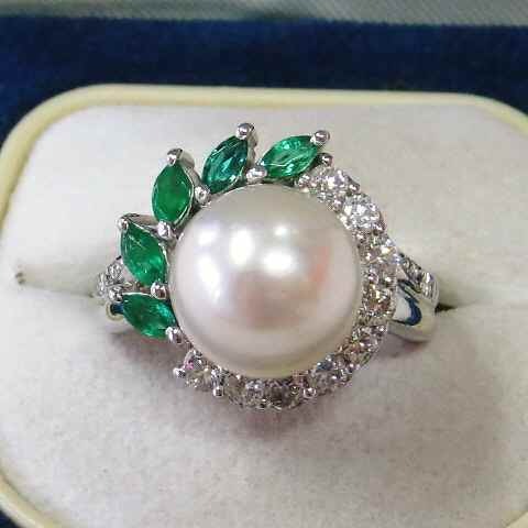 艶のあるパール中心に、エメラルドとダイヤが彩りを豊かにするでデザインリングです。