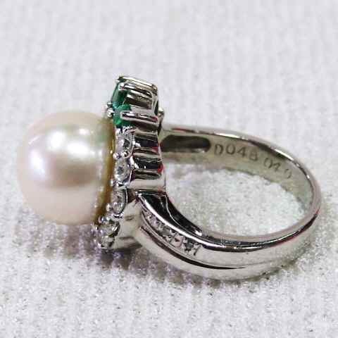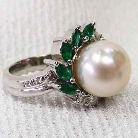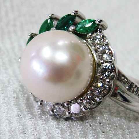 真珠10,5ミリ★エメラルド&ダイヤ取巻き☆プラチナ製リング