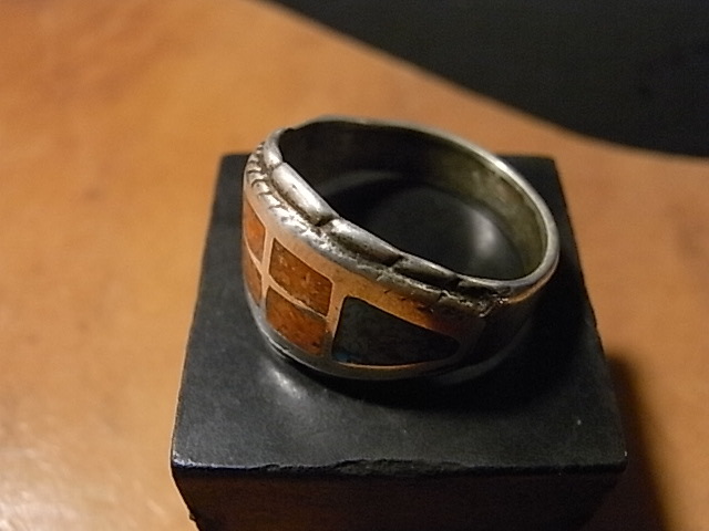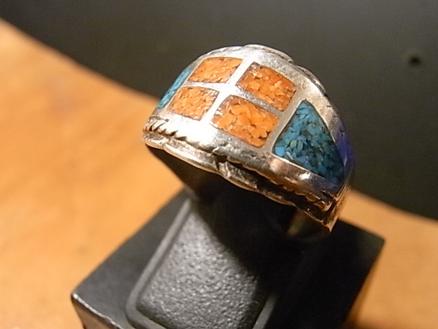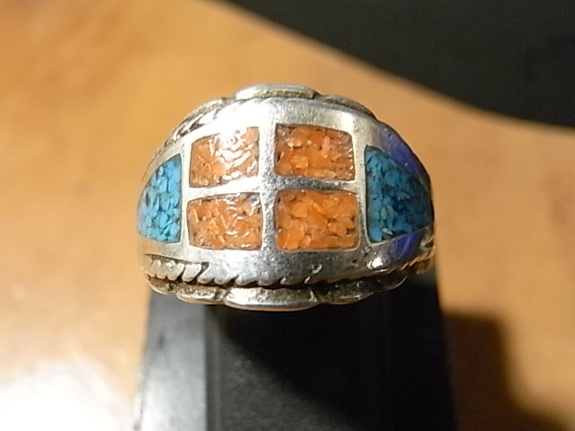 こちらは、1970~80年代のスターリングシルバー製のキャストリングで、ターコイズ&コーラルのチップインレイが施されています。
