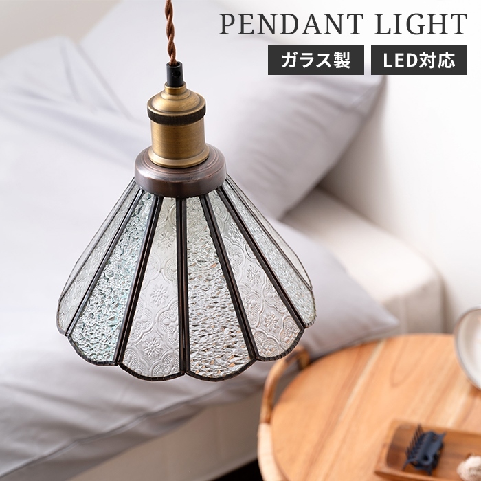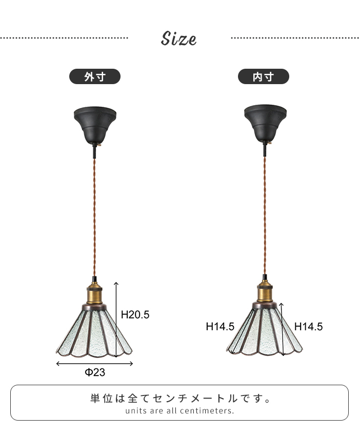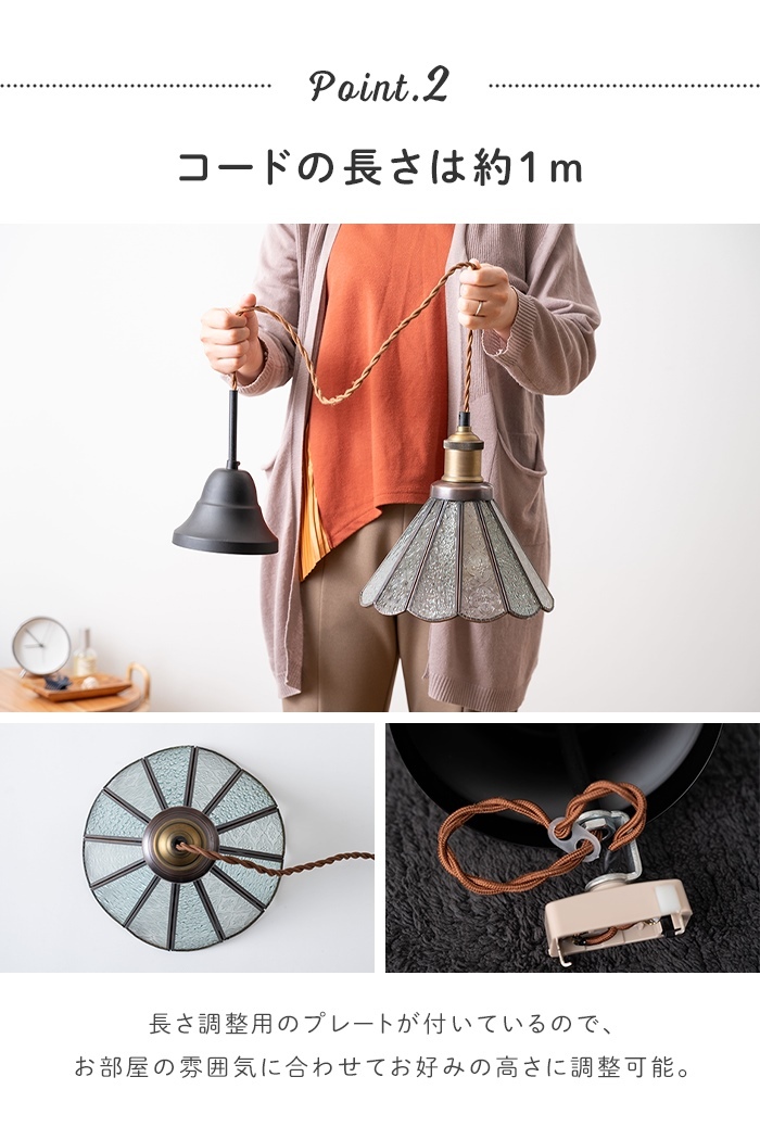 レトロ感漂うペンダントライト。 ステンドグラスのシェードは立体的な模様が特徴的。 どこか懐かしいノスタルジックな雰囲気を感じさせます。 一灯はもちろん。広範囲には多灯付けがおすすめです。 形も特徴的なステンドグラス。シンプルだけど可愛らしいステンドグラスは消灯時にも立体的なデザインがインテリアとして演出してくれます。 点灯時の表情の変化。シェードの内側は光を反射して美しいデザインを楽しめます。消灯時とはまた違った表情をお楽しみください。 ご家庭のシーリングプラグに付けられます。 コードの長さを調整できます。 |