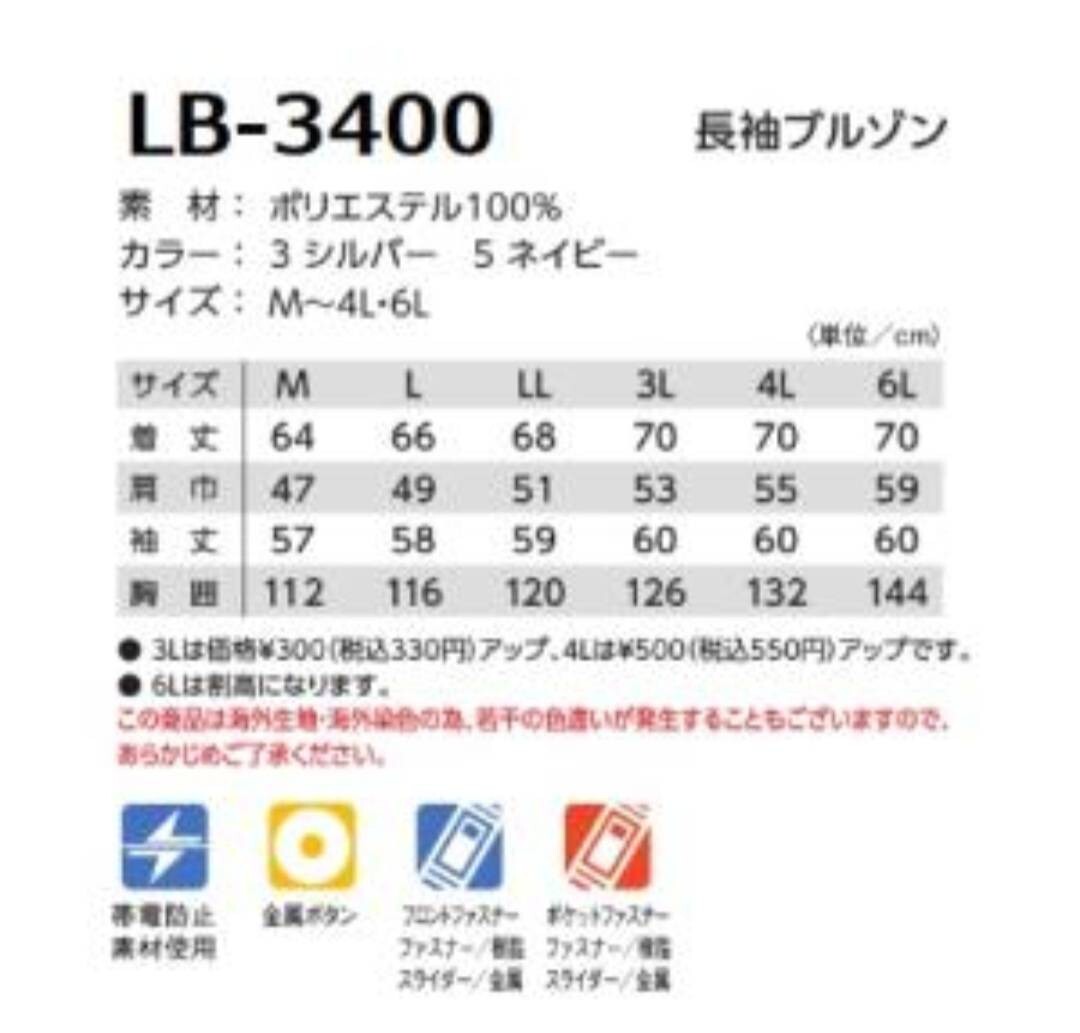 3735 TAKAYA|長袖ブルゾン|LB-3400|シルバー|3Lサイズ|春夏|新品未使用|帯電防止|ポリエステル100%|作業着|ジャンパー|ジャンバー|グレー