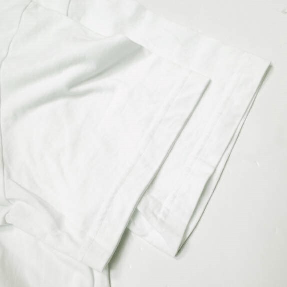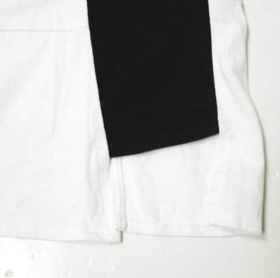 本作は無地のクルーネックTシャツをベースに、ヘム部分にランダムなパッチワークを施したモノトーンな一枚。
