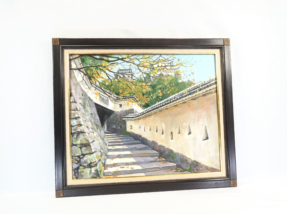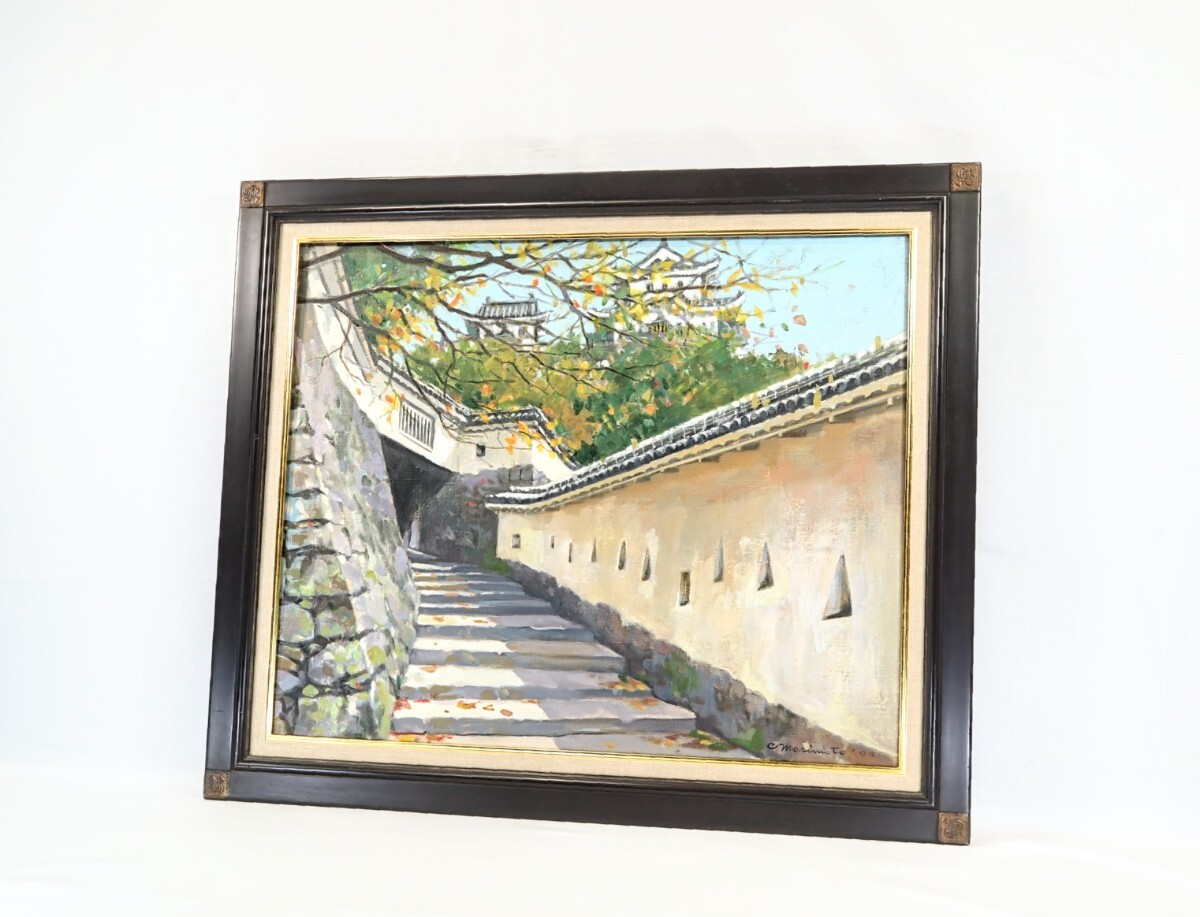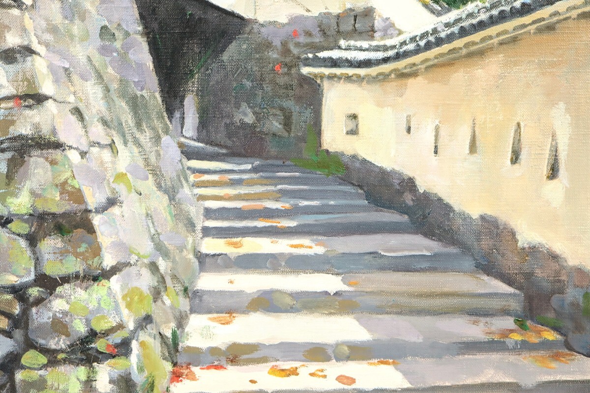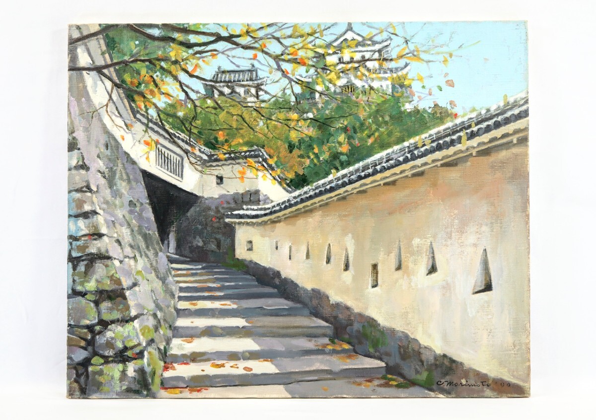 真作 森本近司 2000年油彩「姫路城」画寸 F15 兵庫県出身 新協美術会委員 白鷺城天守閣を見上げ石段を登る先にある櫓門「はノ門」10746
