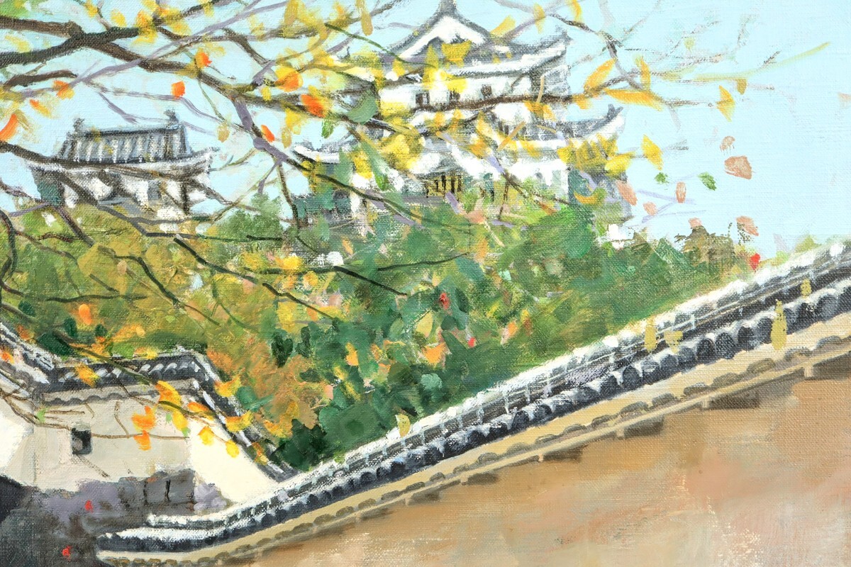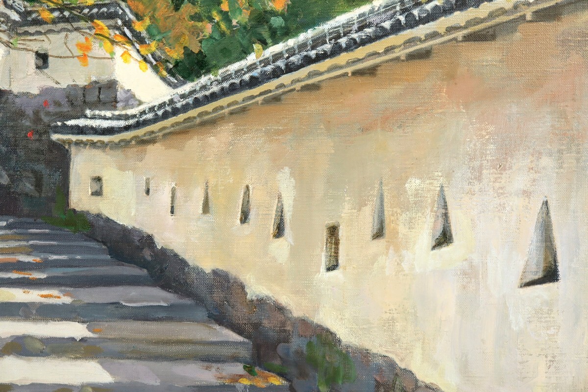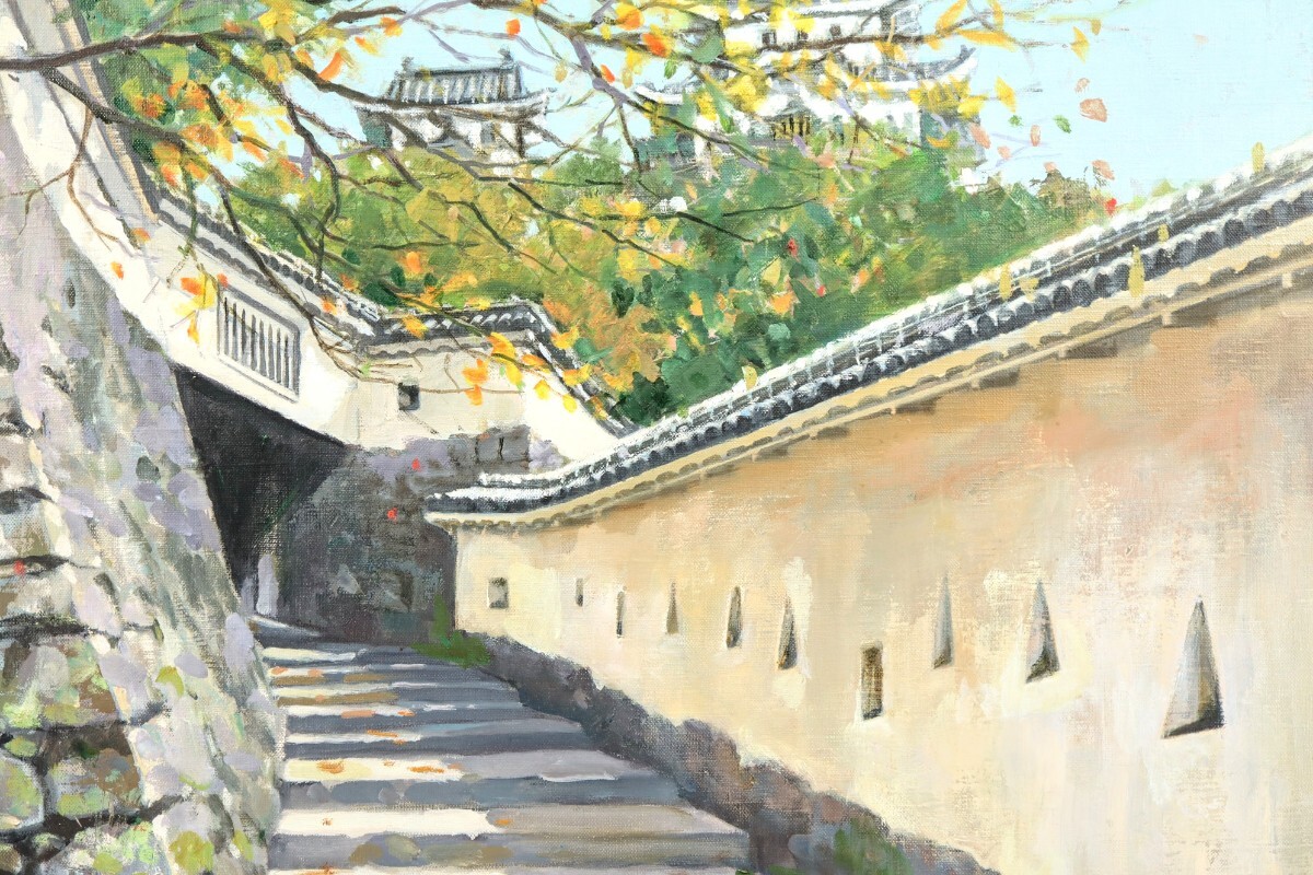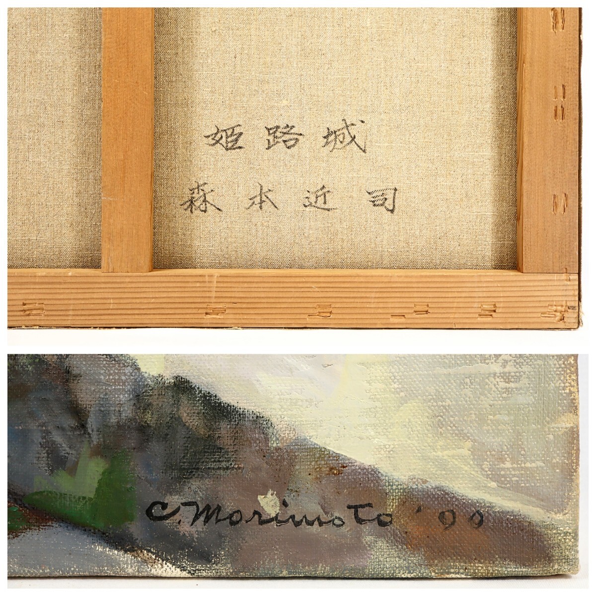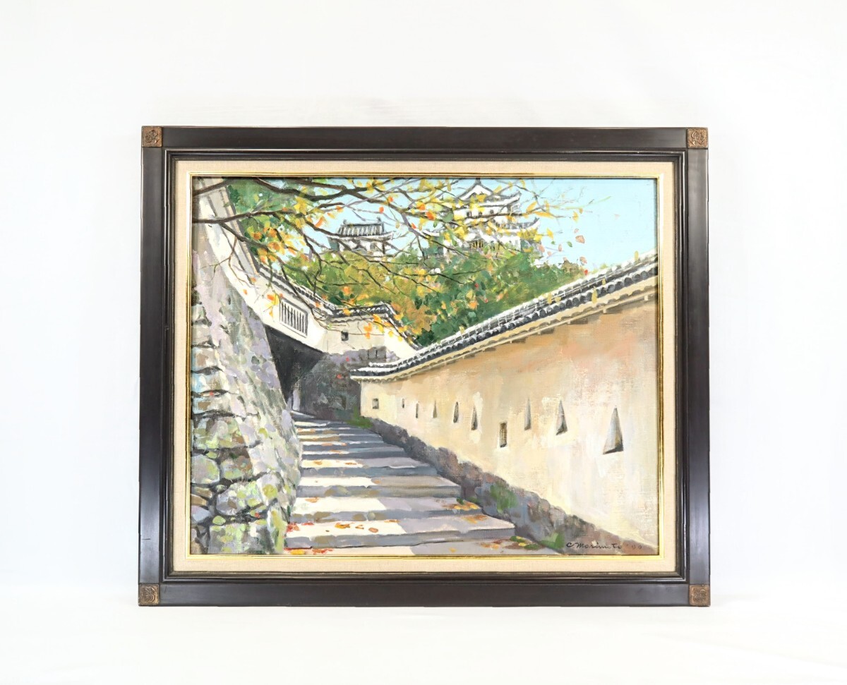 真作 森本近司 2000年油彩「姫路城」画寸 F15 兵庫県出身 新協美術会委員 白鷺城天守閣を見上げ石段を登る先にある櫓門「はノ門」10746