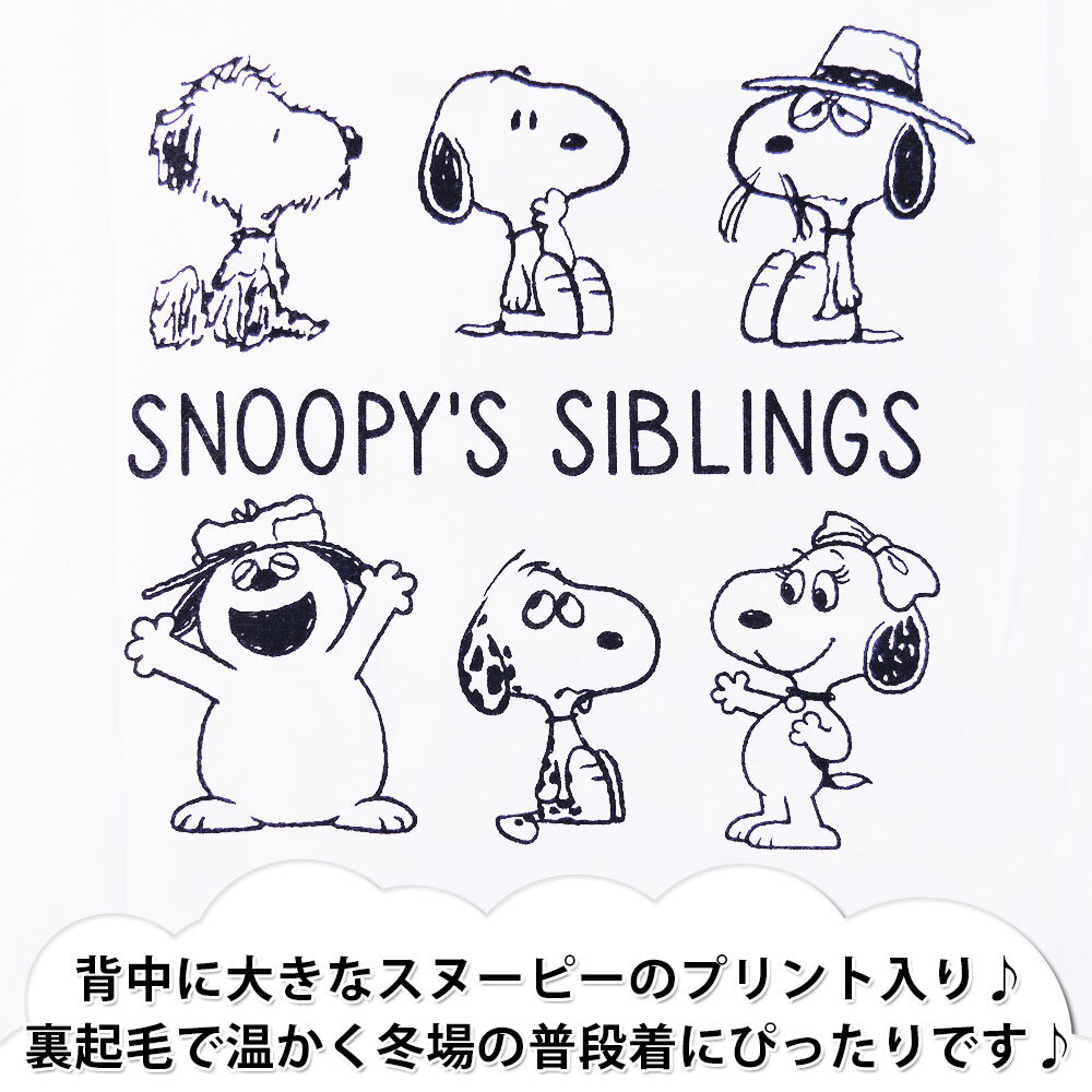 正規店仕入れの新品未使用品です 綿とポリエステル素材で、吸汗速乾に優れます 背中に大きなスヌーピーのプリント入り 裏起毛で温かく冬場の普段着にぴったりです |