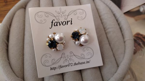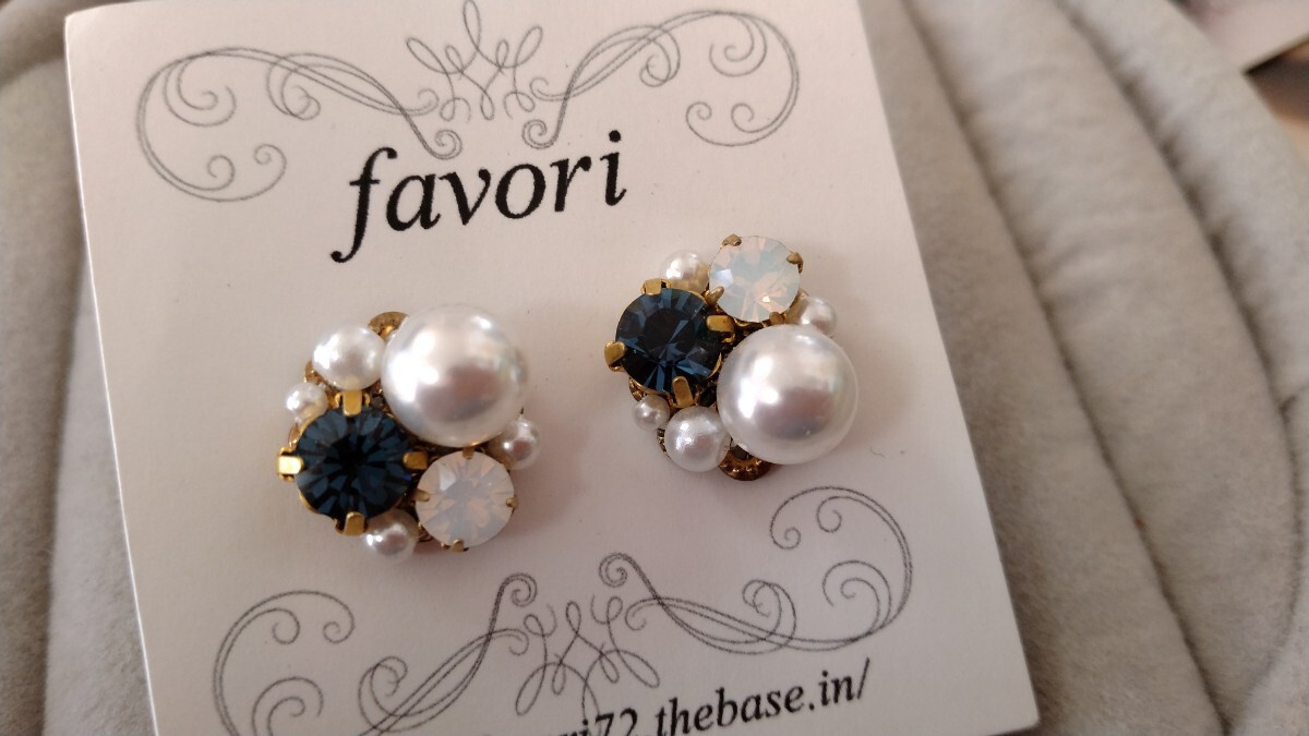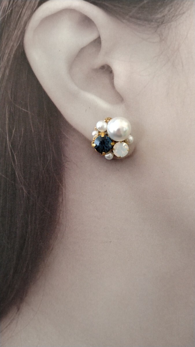 パールビーズ&黒ビジュー&ゴールドカラー ピアス