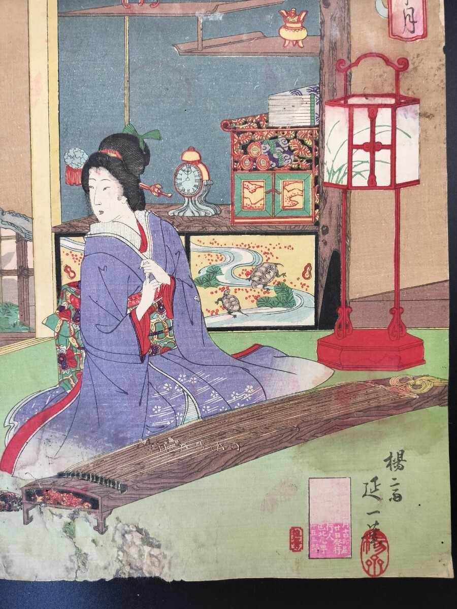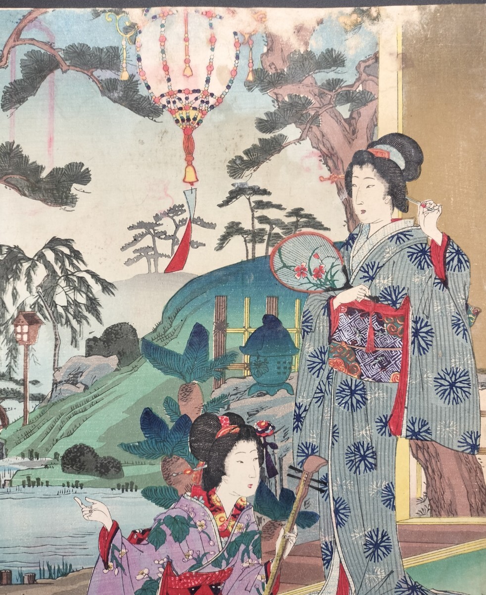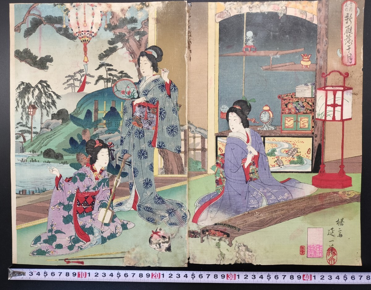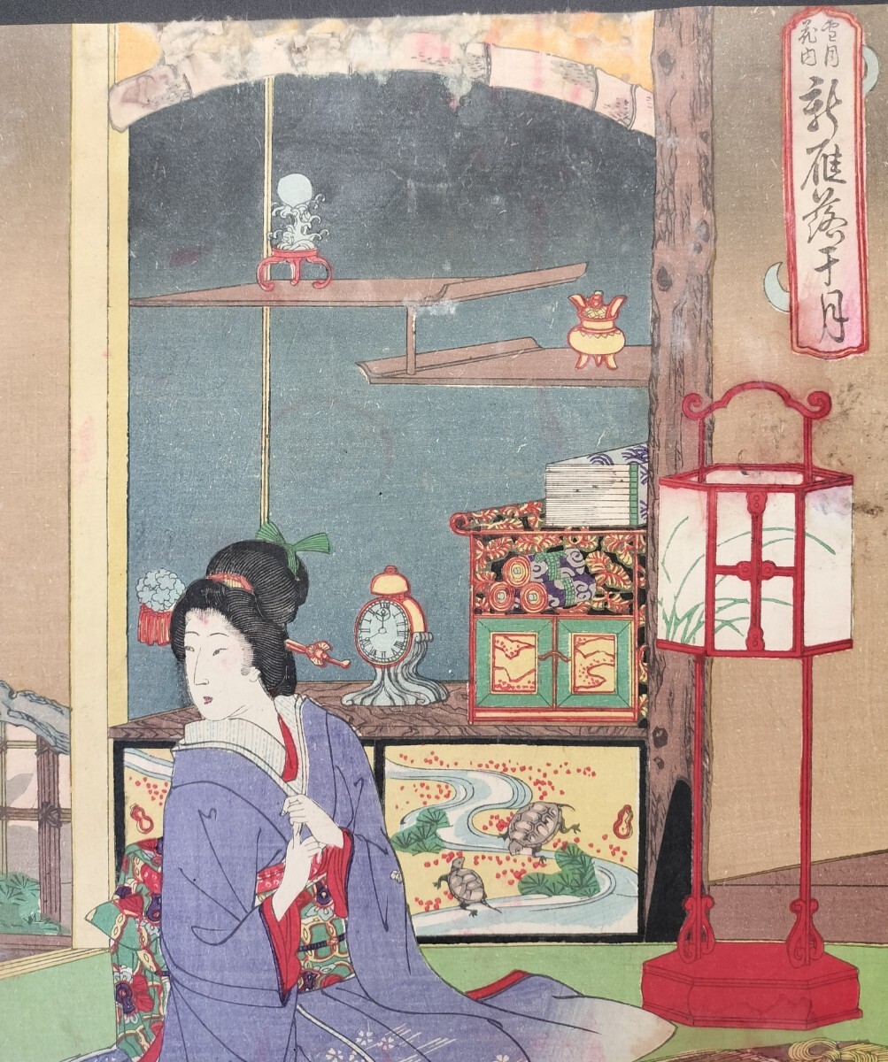 明治期/真作 楊洲周延「雪月花内新雁落于月」本物浮世絵木版画 美人画 錦絵 大判 二枚続き 裏打ち