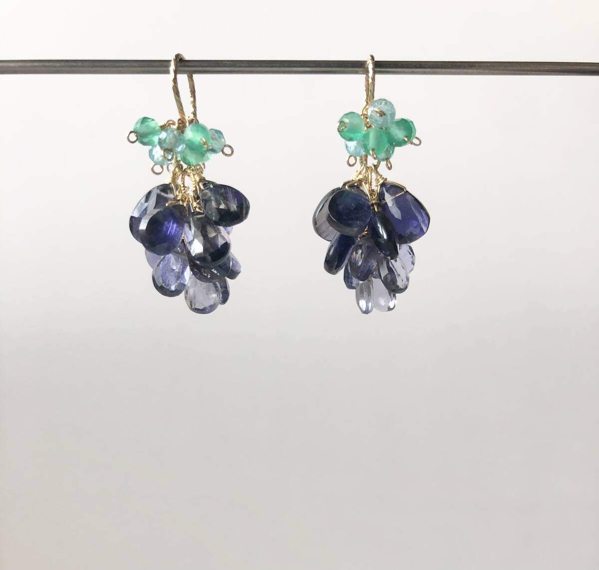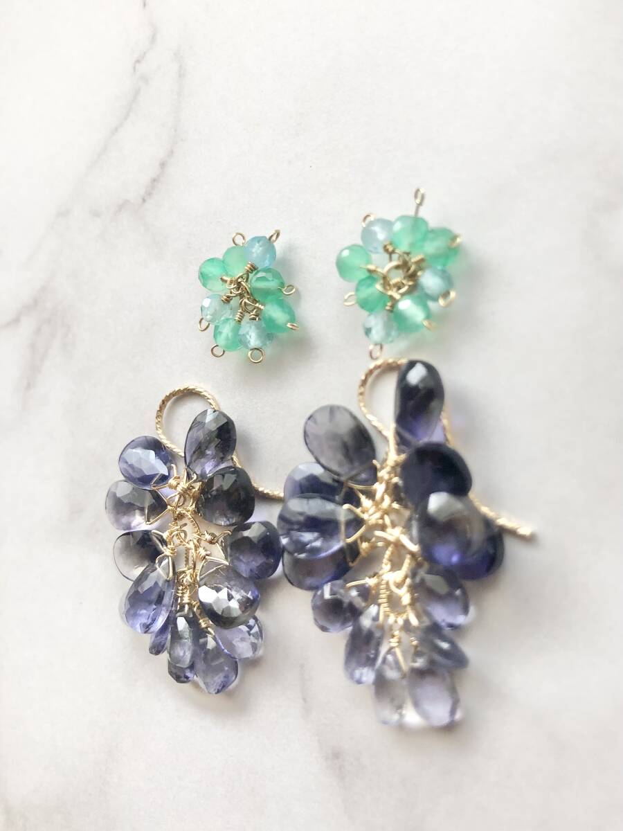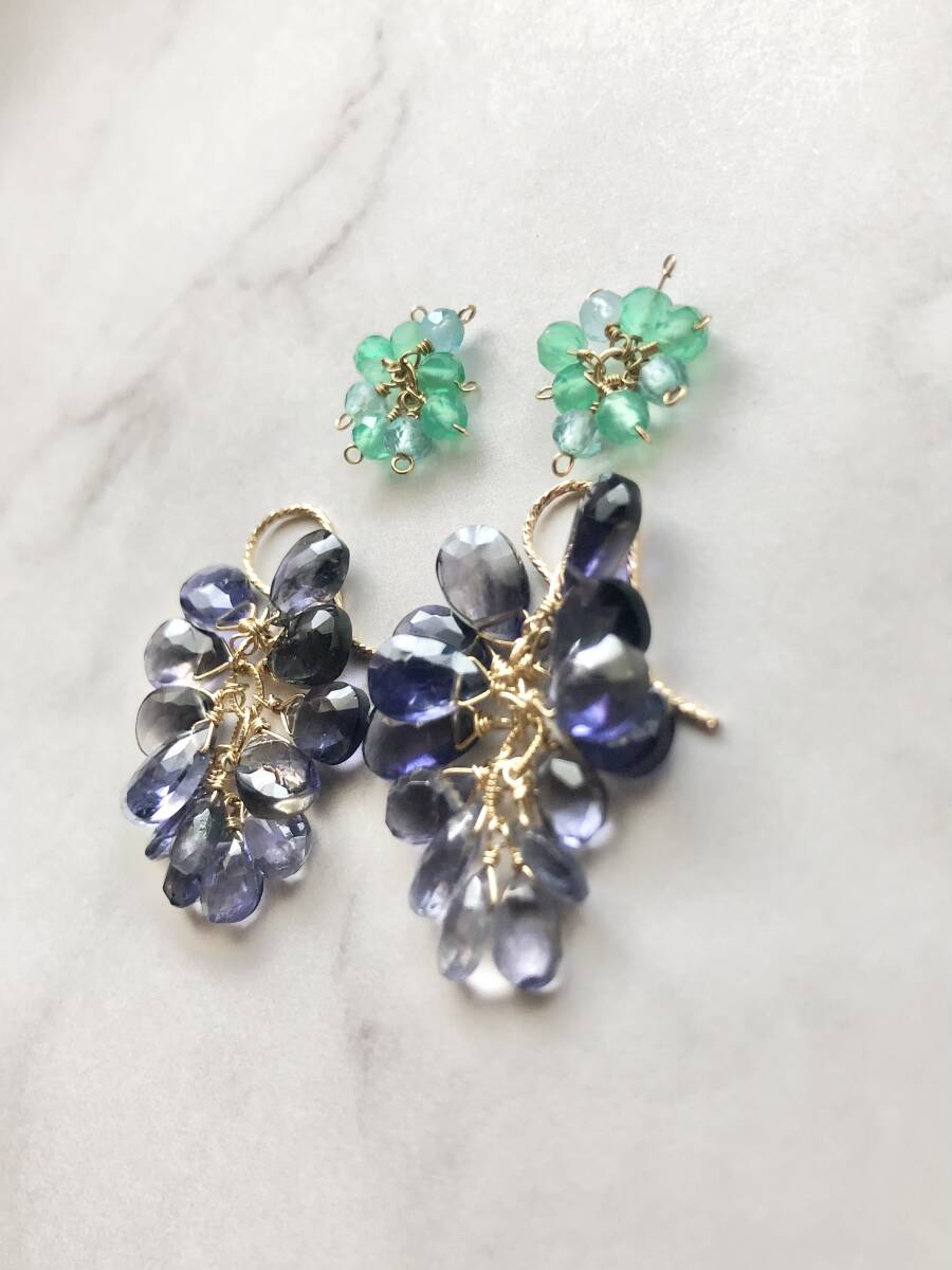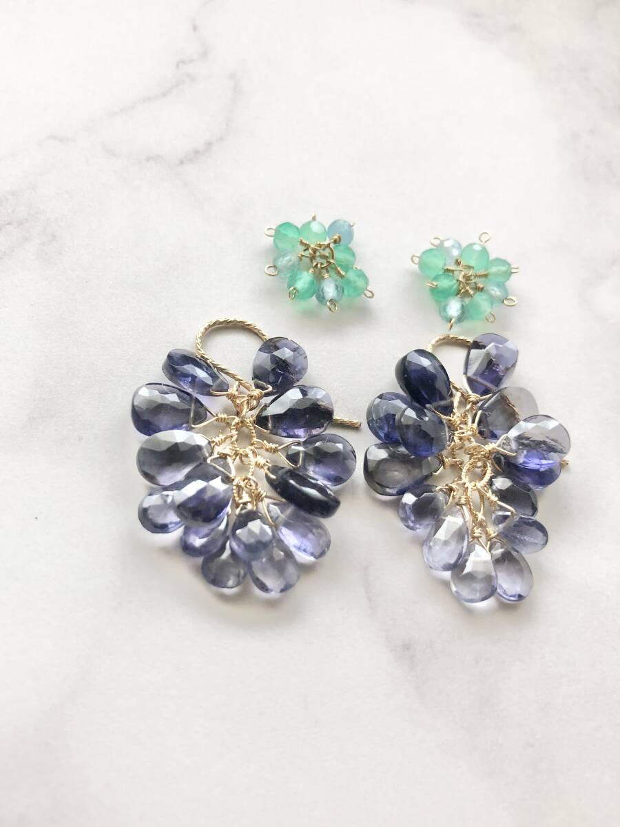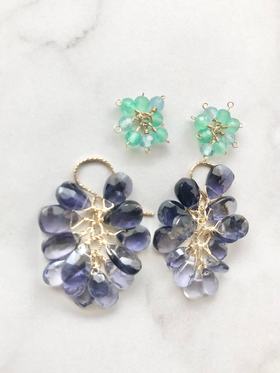 数多くの出品商品の中からご覧頂き誠にありがとうございます。 アイオライト盛りだくさんのピアスです。 こんもりと可愛いです。 上のグリーンのは、ぶどうみたいだなと思ったのでオマケです。 遊び心でよかったら使ってみてください。 輪っか部分をフック先端から通して、お写真のようになっています。 ※ご使用後はジュエリークロスで優しく拭いて頂くと、艶や輝きを保てます。 ジュエリークロスは、眼鏡や時計を購入した際に付いている布でも大丈夫です。 ※ 以前に別サイトにて出店しネット販売をさせて頂いておりました。 時間的に継続が難しくなり撤退後、普段は自身と身の周りの方々に作成していますが、材料の在庫過多のため限定数で出品させて頂きます。宜しかったらどうぞお迎えご検討ください。 |
