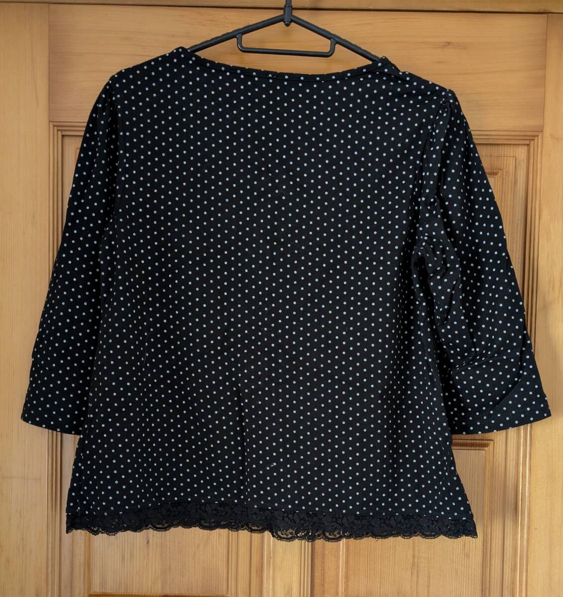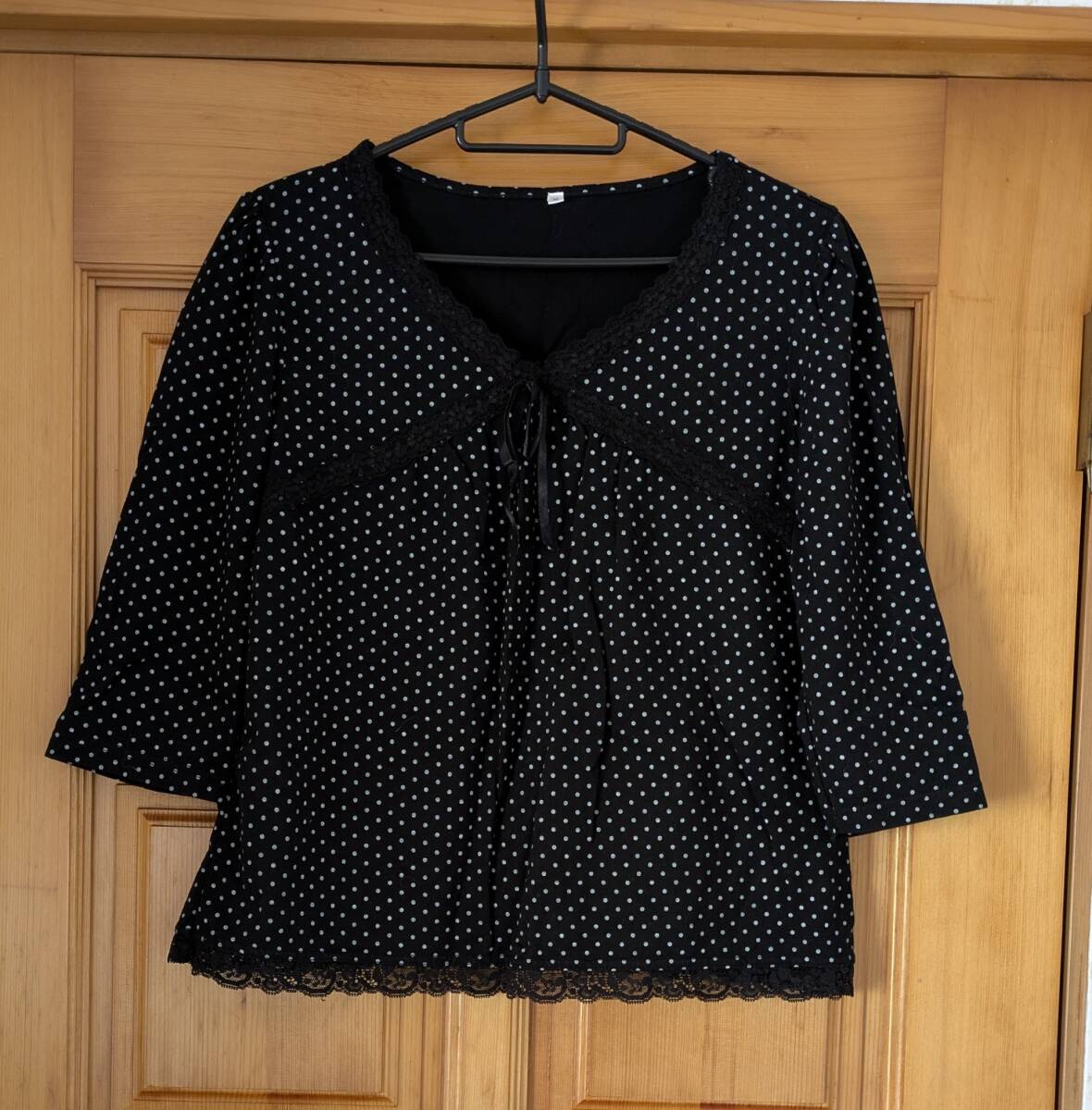 レーストリムとリボン結びのデザインが特徴のブラック・ホワイトドットの五分袖トップス。