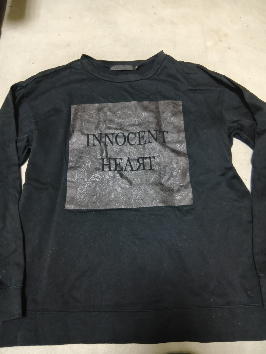 INNOCENT HEARTのプリントロゴが特徴的な黒の長袖トレーナー。