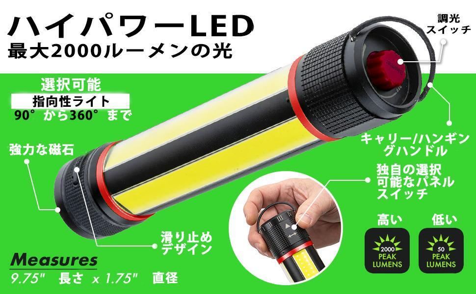 作業灯正面にCOB面光源技術が採用されており、均一な面で発光するため、光りのバラツキを抑え、直視できない程の眩しい光を照らし、360度の広角で照射し、より幅広い範囲を真昼のように照明できます。