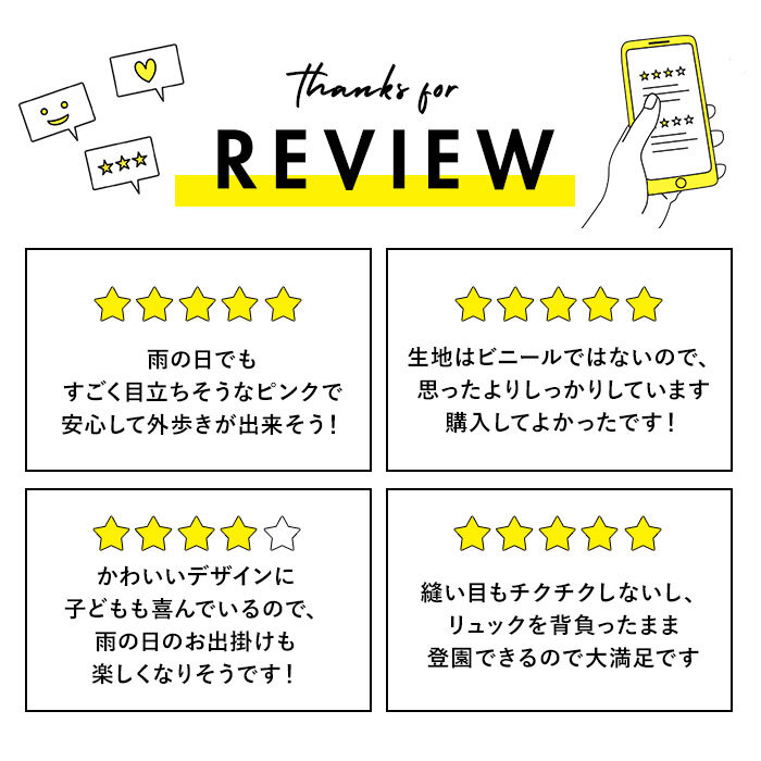 | 商品説明 | ・・雨の日もhappyに!優しい色合いとプリントが可愛い、キッズレインコート♪ ・フードの広い範囲がクリア素材で作られているから、視界をさえぎらない♪ ・背面には反射テープつき。薄暗い雨の日でも、車のライトに反射して光るので安心。 ・後ろ身頃に充分なタックを入れた、ゆったりとした作り。リュックやランドセルを背負ったまま着用できて、とても便利♪ ・袖口は雨の侵入を防ぐゴムテープ入り。多少大き目のサイズを購入しても袖丈の調節が可能♪ ・お子様でも脱ぎ着がしやすい、スナップボタン。 ・お気に入りのカラーを選んで、雨の日も楽しくお出かけ♪ |