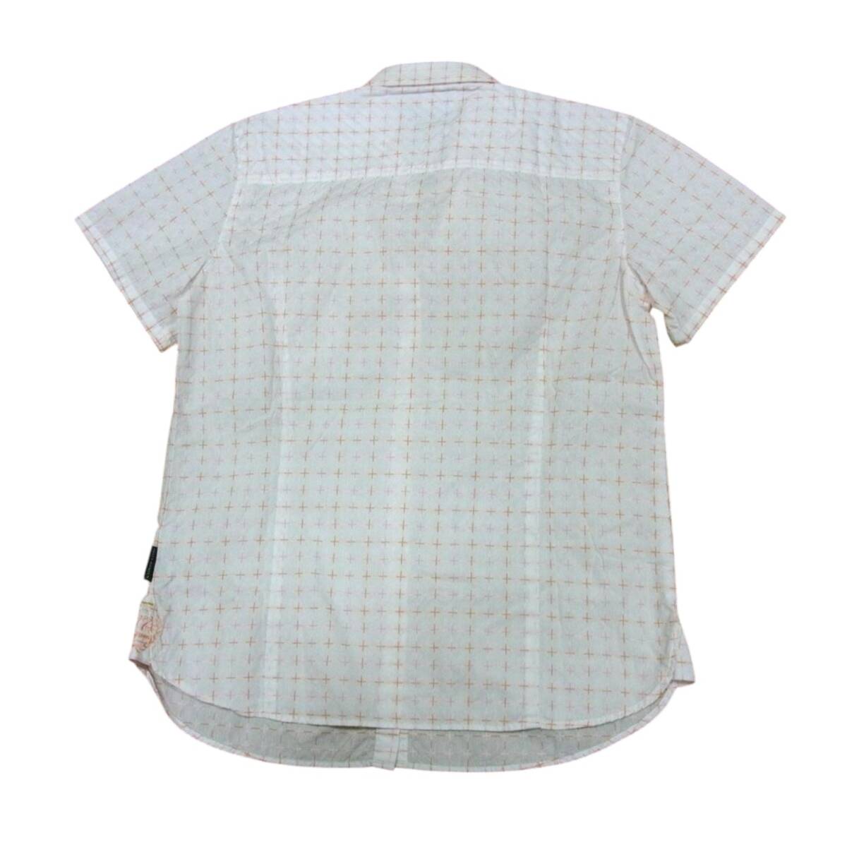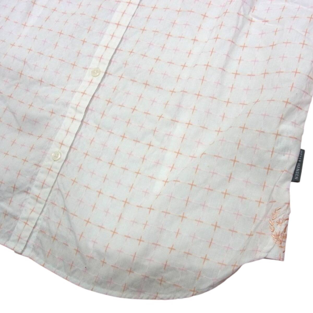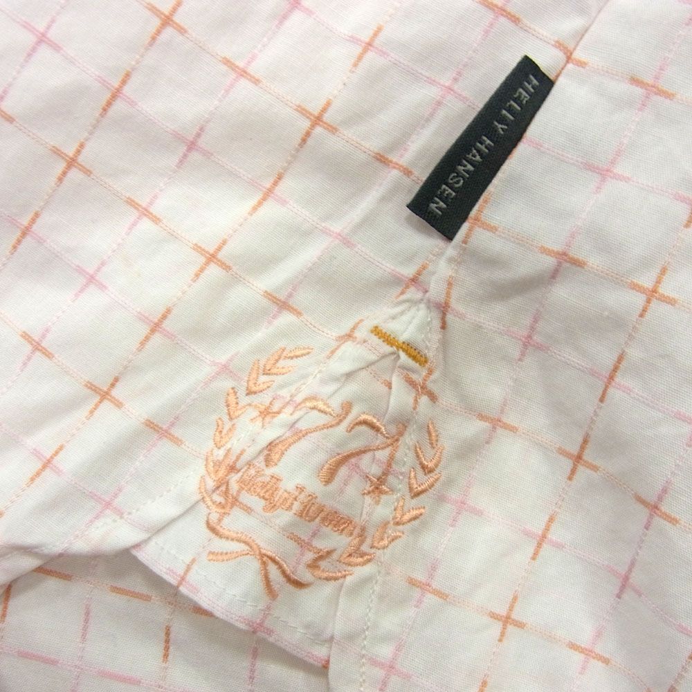 ◇  シンプルデザイン!   レディース M!                ヘリーハンセン の   薄オフホワイト系ベースに    薄い ピンク系 & 薄めのオレンジ系   総柄 デザインが お洒落な、      吸汗速乾♪ コットン素材が着やすい♪   前開き  半袖 シャツ  ドライシャツ  に成ります。