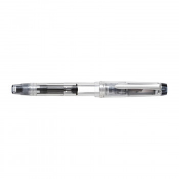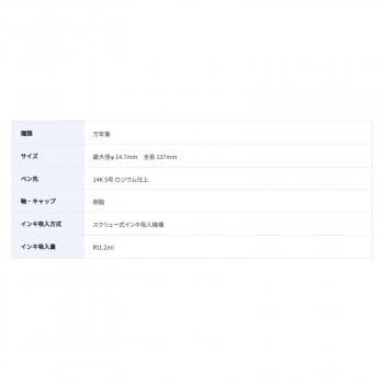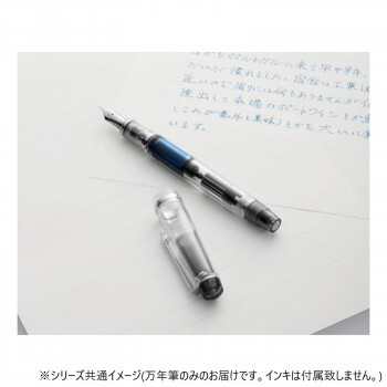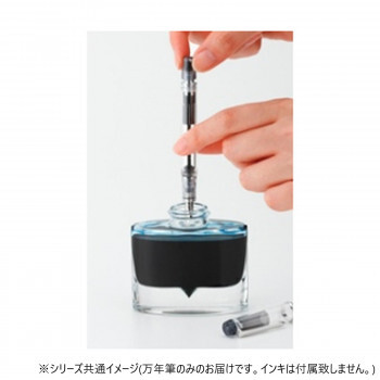 | 回転吸入機構を採用した万年筆です。インキ供給方式は、ボディ後部の尾栓を回すことでペン先からインキを吸い上げる回転吸入機構を採用した本格タイプの万年筆。インキ容量は、1.2mlです。スケルトンボディは、インキ残量が一目で分かるだけでなく、吸入したインキの色でボディを彩ることもできるデザインです。インキの色を楽しみながら書くことができます。 ペン先には、万年筆のなめらかな書き味や機能性を最大限に引き出す14Kを採用。ペン先の「しなり」により、文字に強弱のニュアンスを持たせることができます。 |