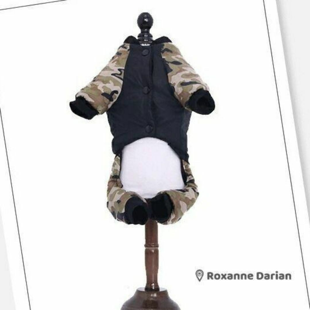 迷彩柄が可愛い、ファッショナブルなペット用ダウンジャケット。厚みがあって保温性もバッチリ、寒い日のお散歩や外出に最適です。小型犬、特にパグにぴったりのサイズで、ジャンプスーツタイプなので着脱も簡単。さらに、防水加工されているので雨の日も安心です。