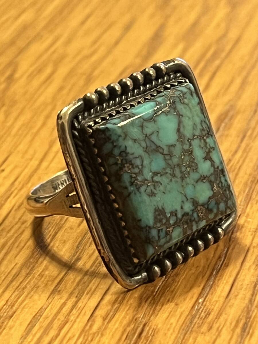 ナバホの作家 ロビンツォーシー Robin Tsosie のストーミーマウンテンターコイズをセットしたリングです。