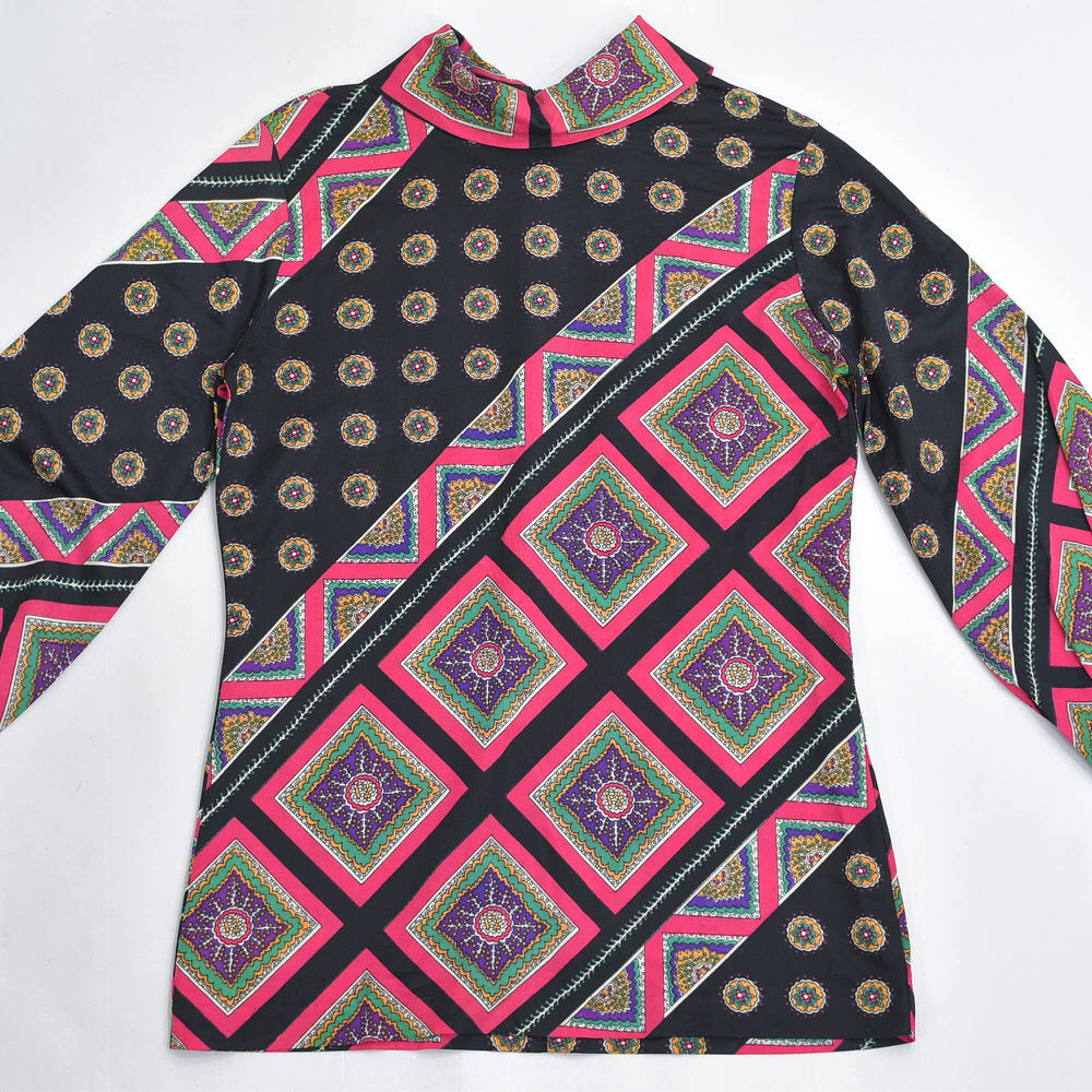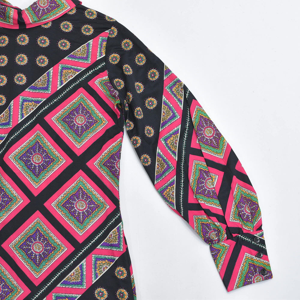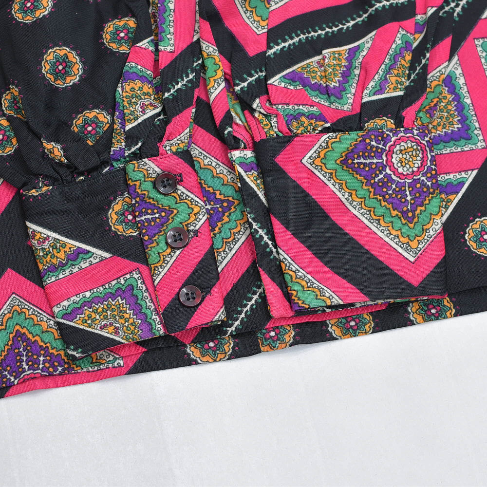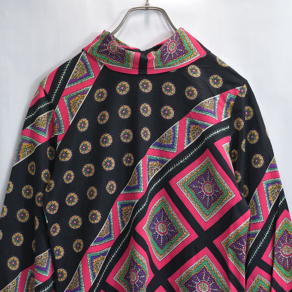60s KORET OF CALIFORNIA アンティーク調 総柄 デザイン ポリエステル プルオーバーシャツ ヴィンテージ ブラック ビンテージ USA アメリカ古着 レディースM相当