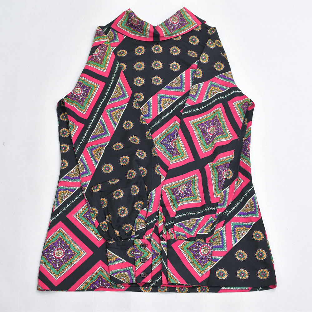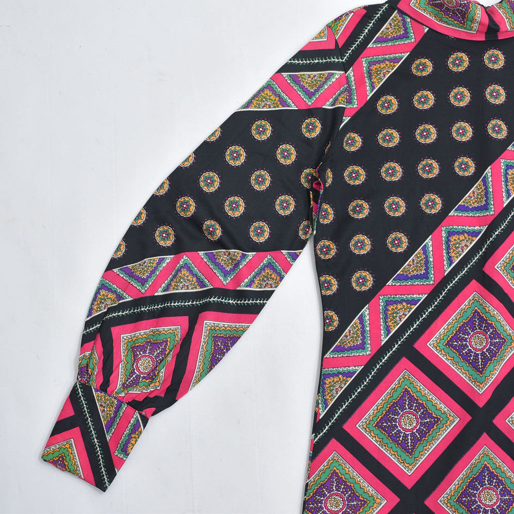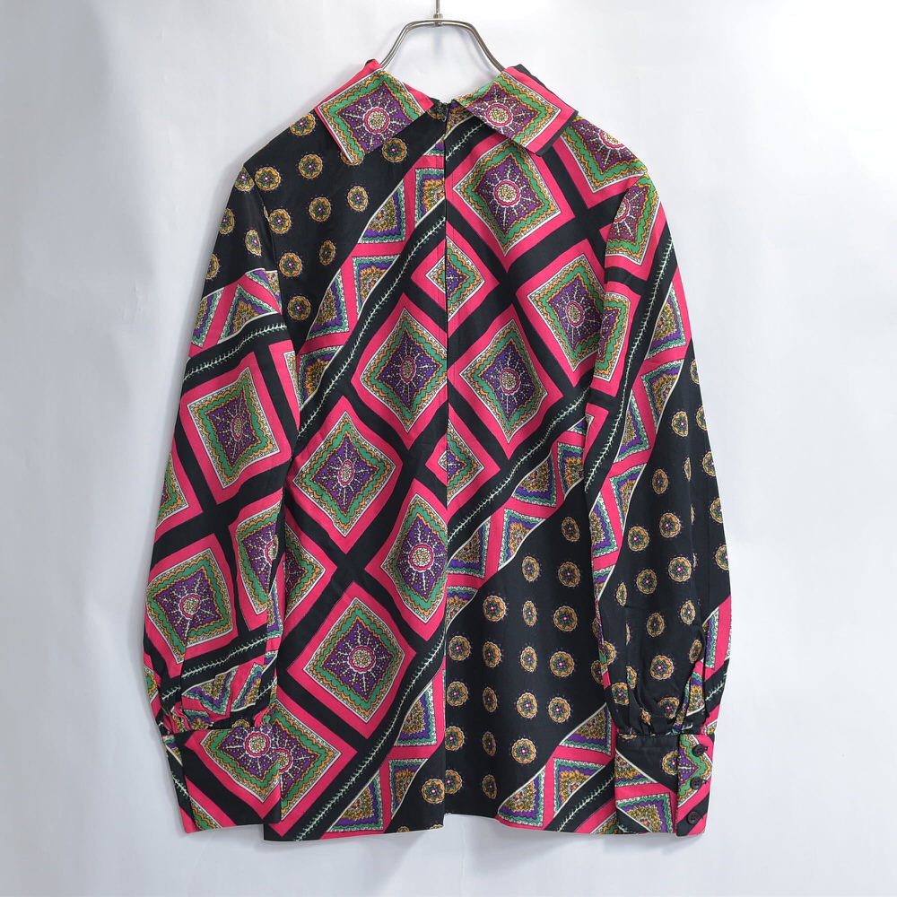 ブラックをベースに、アンティークな趣を感じる小紋柄や幾何学模様が描かれたコレット・オブ・カリフォルニアのポリエステルシャツ