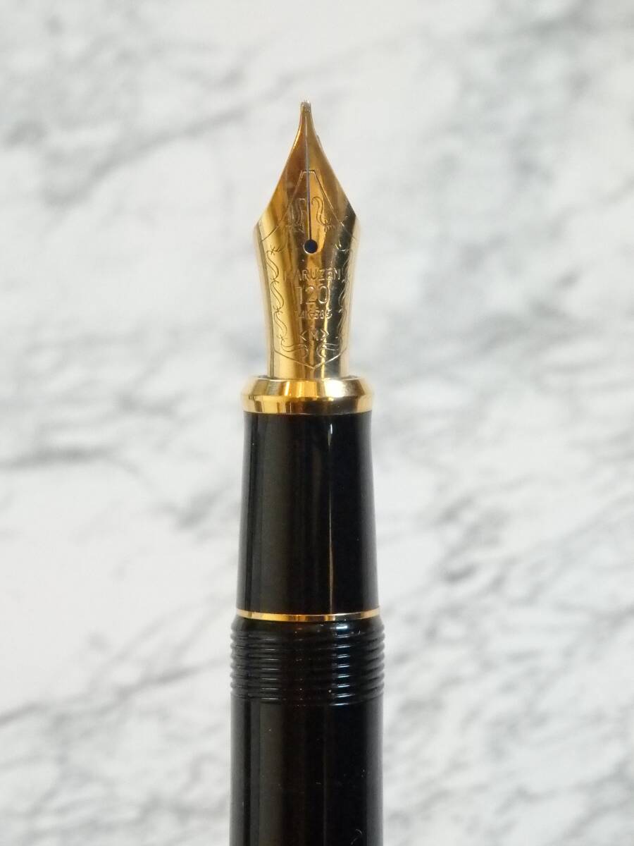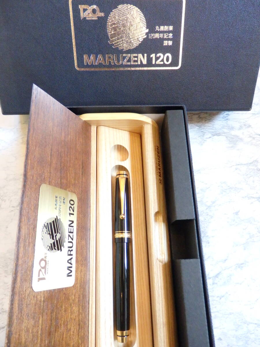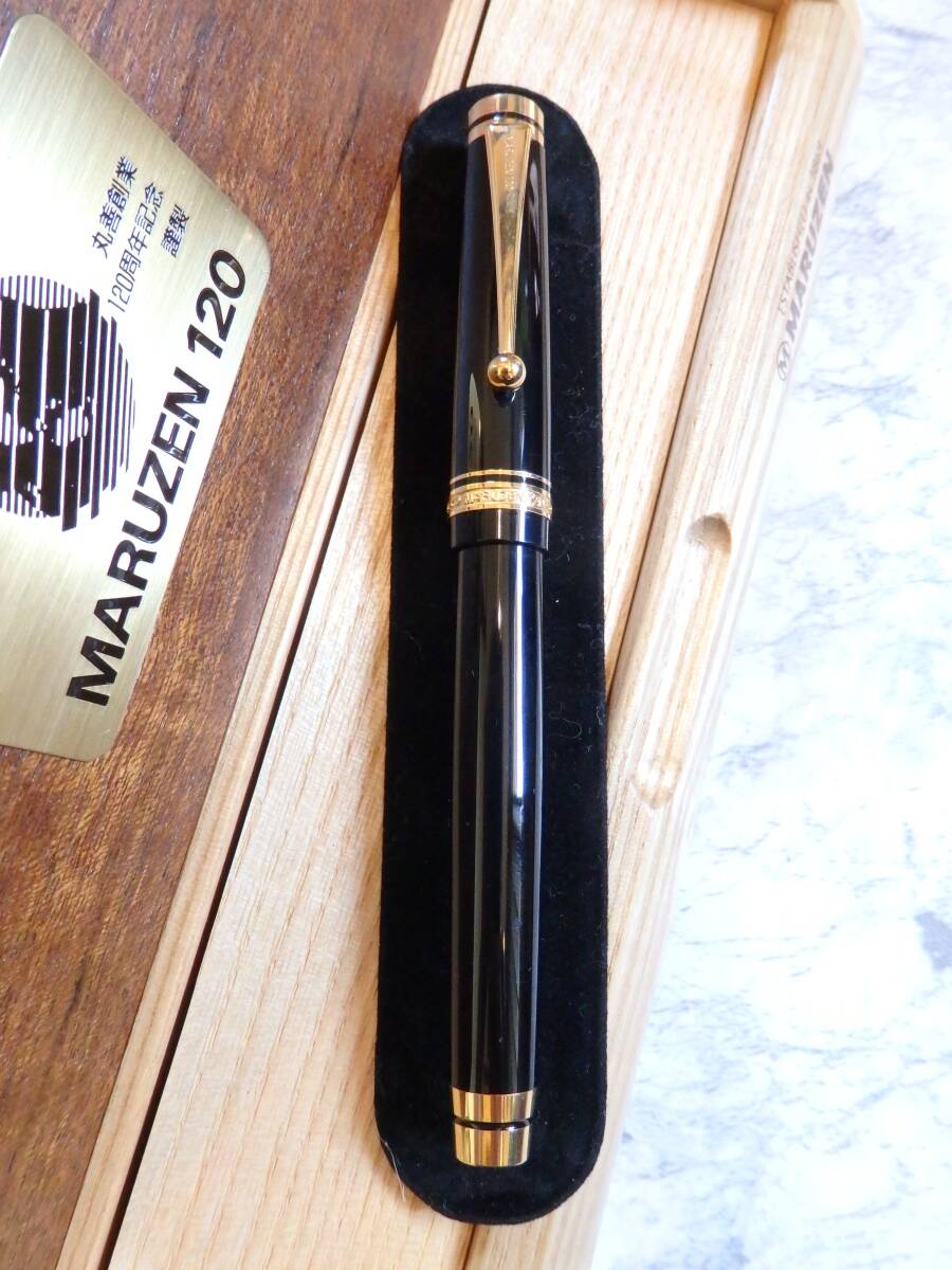 ◆【ほぼ未使用】【送料410円~】丸善 マルゼン120周年記念 エボナイト削り出し手作り万年筆 ペン先:14K585ソリッドゴールド M 箱付き