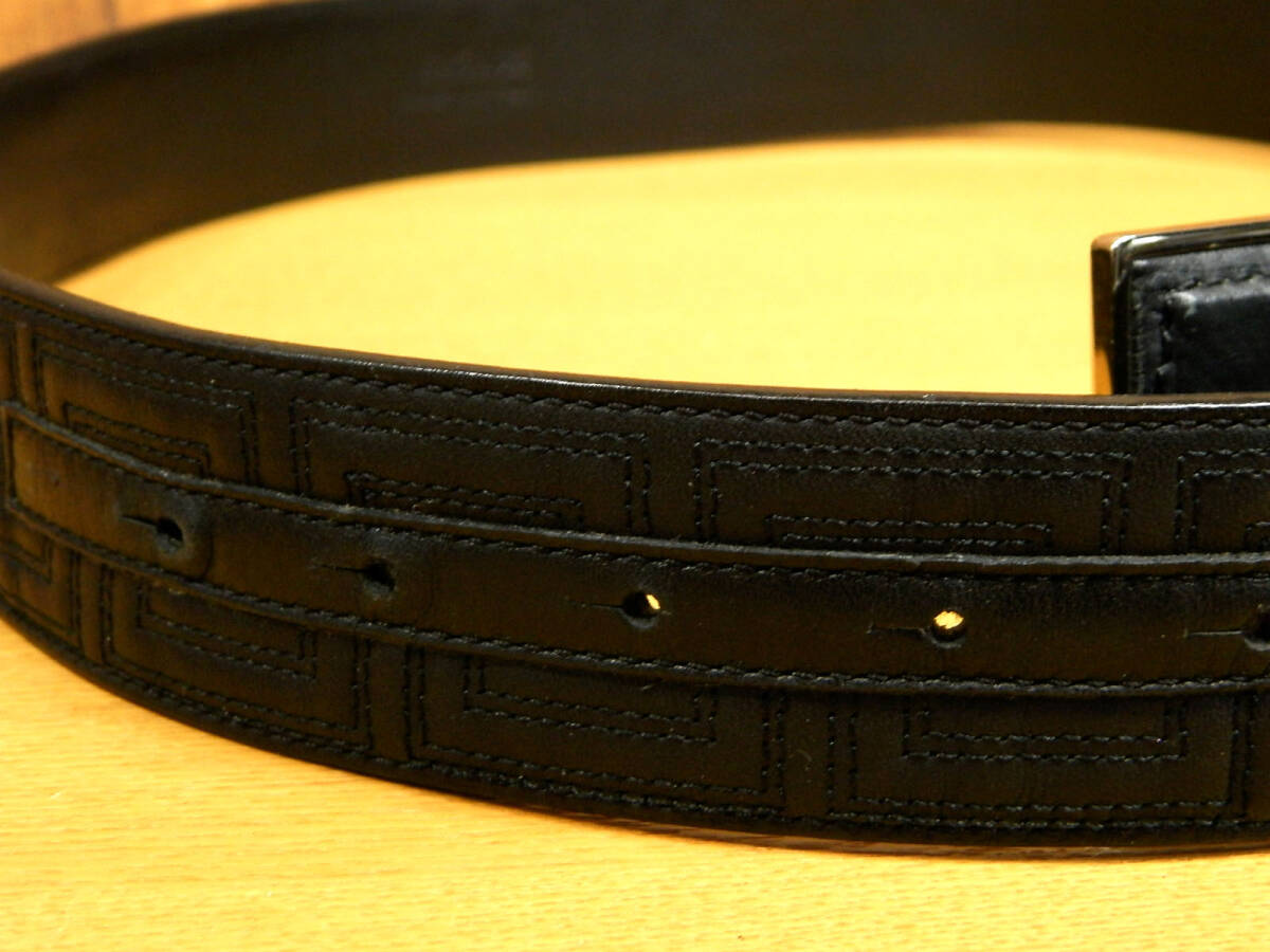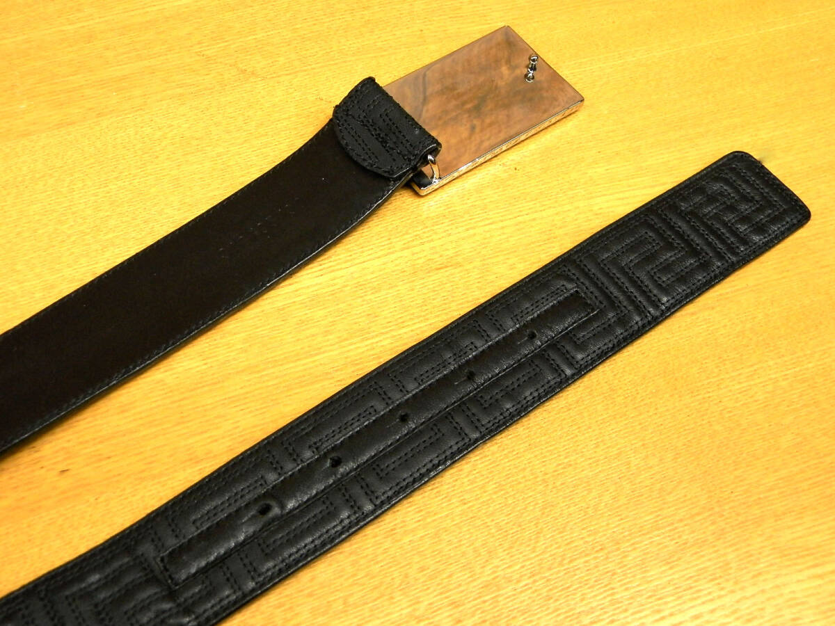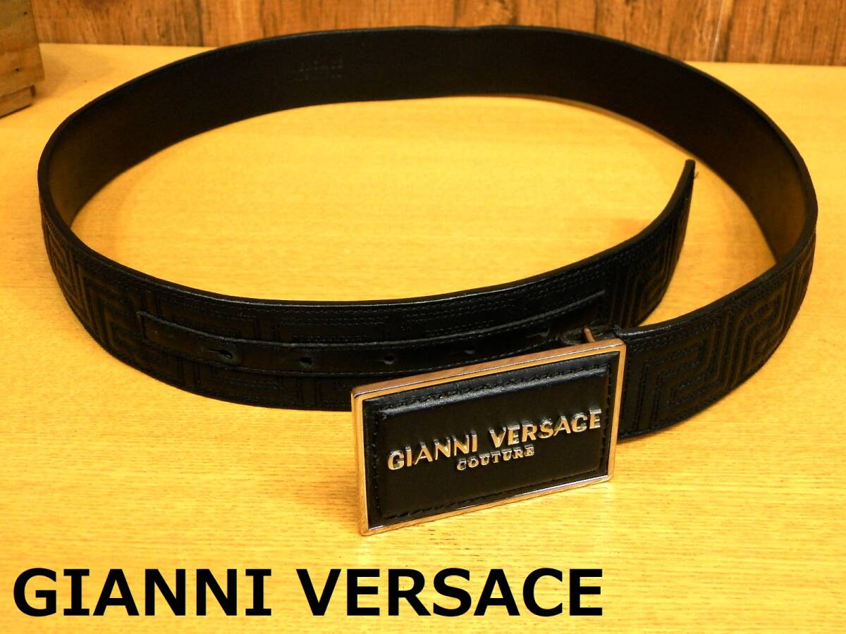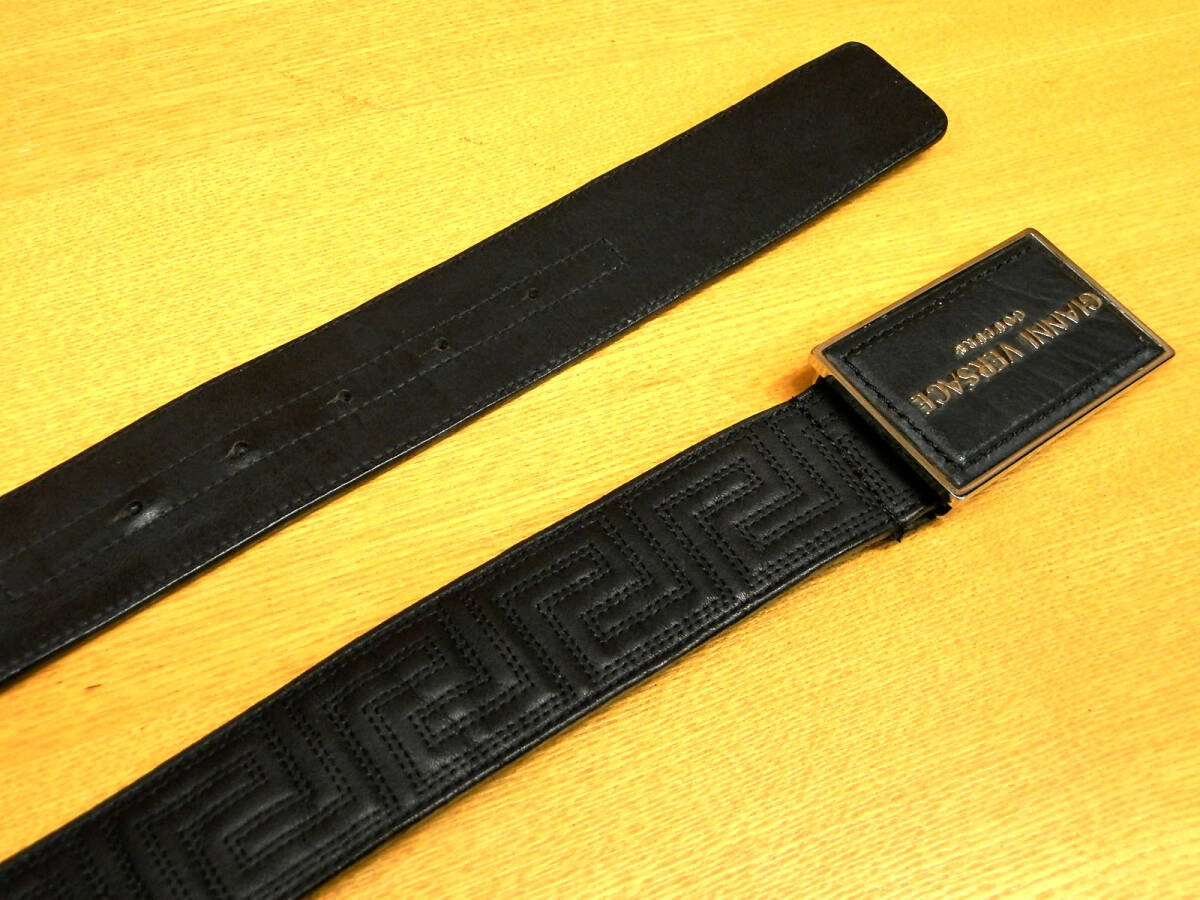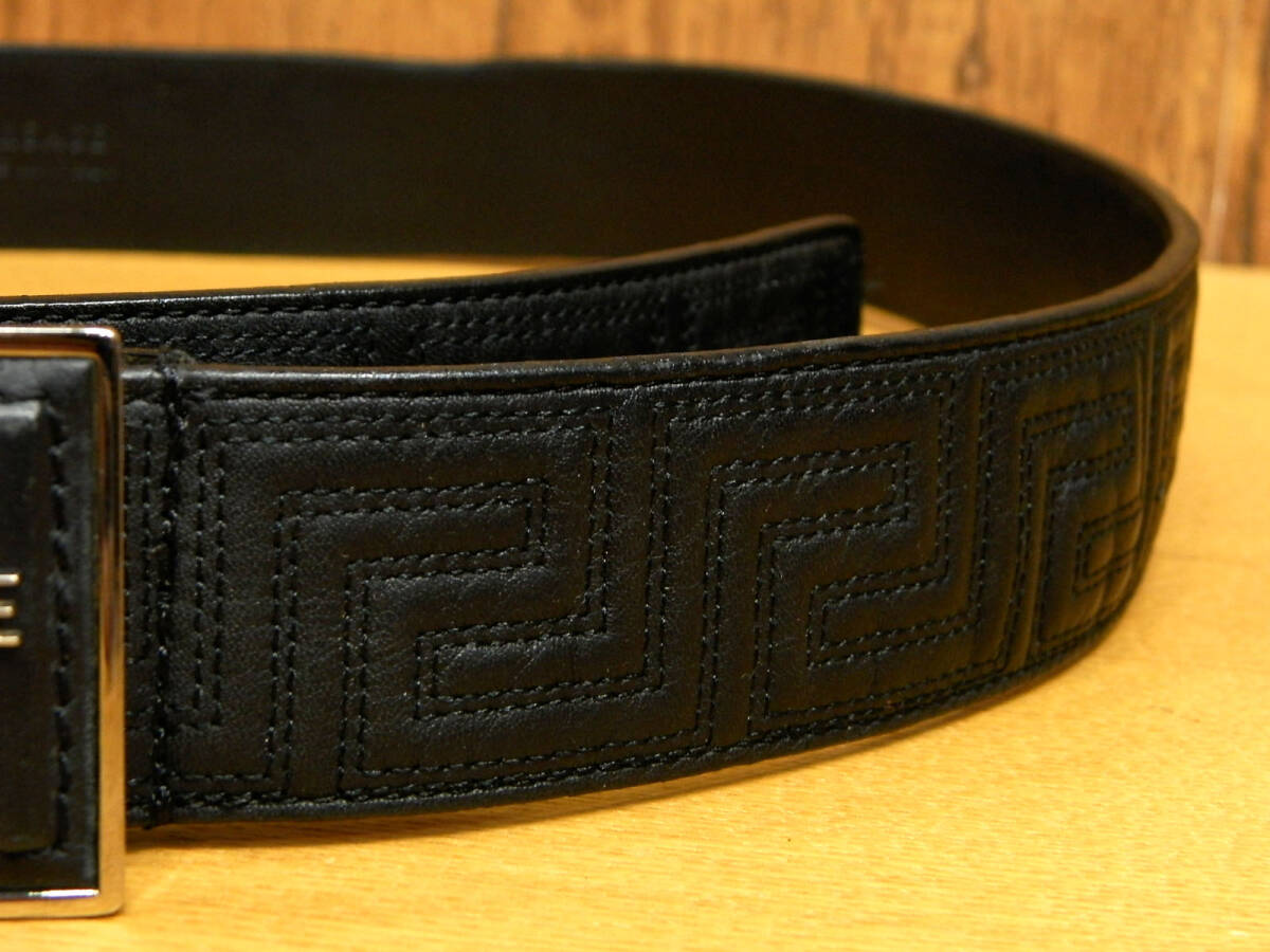 ☆VERSACE ヴェルサーチのグレカ柄刺繍デザイン ベルト☆黒ブラック☆ジャンニ ベルサーチ ロゴ バックル 48