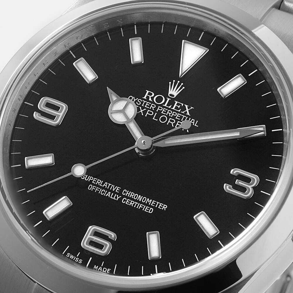 | モデル情報 | 「探検家」と名付けられたエクスプローラーI。ロレックスのスポーツモデルの中でもシンプルで飽きのこないデザインが特徴で、服装や時と場所を選ばず、どの場面でも活躍できる定番人気のモデルです。市場での数も豊富に流通しておりますので、ロレックスのエントリーモデルとしても打って付けです。前モデルの14270と本モデルの114270は、針の太さやデザインなど同一であるため、視覚的な違いはほとんどありません。モデルが切り替わった2000年は、ロレックスのムーブメント製造技術が一気に向上した時期と言われ、それに伴い内部の機械がワンランク上のスペックに改良。Cal.3130 テンプ受けがシングルからダブルブリッジになったことで耐久性が大きく向上しました。 |