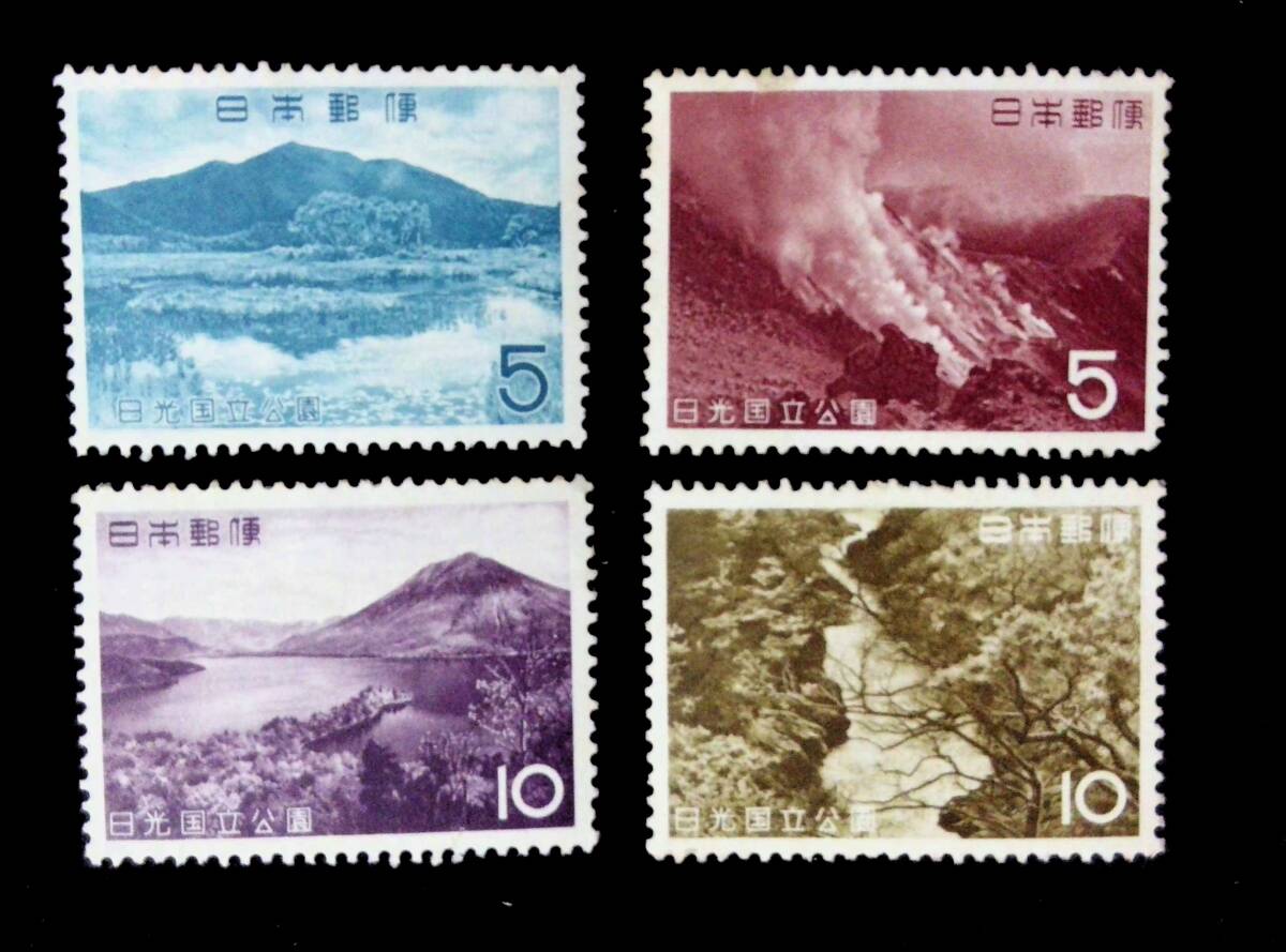 第2次国立公園切手 日光国立公園「尾瀬ヶ原と至仏山・那須茶臼岳と噴煙・中禅寺湖の八町出島と男体山・塩原渓谷 潜竜峡」1962年9月1日発行