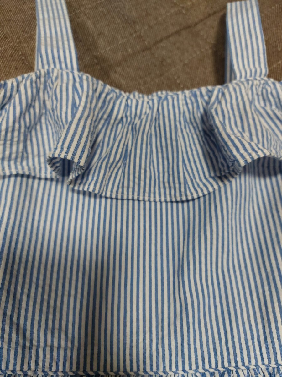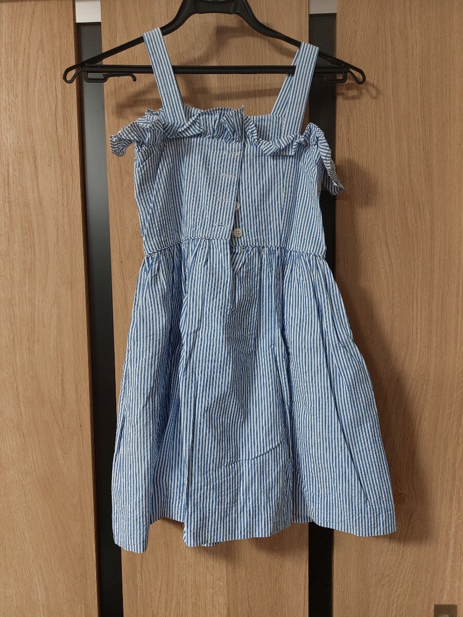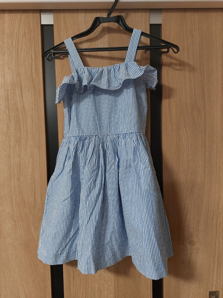 水色と白のストライプデザイン、フリル付きのノースリーブワンピース。